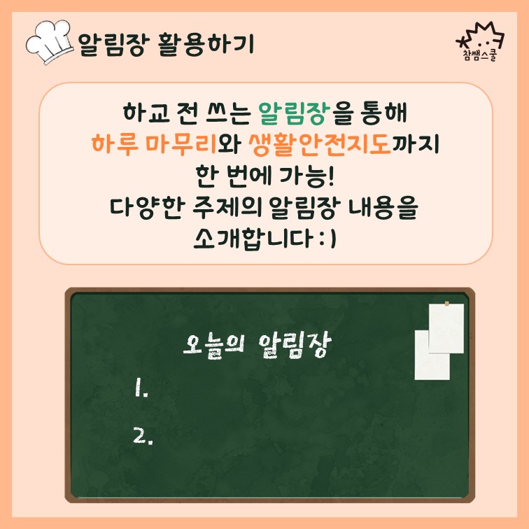1. 알림장 활용하기 : 위생, 스마트폰, 인성교육 등 다양한 주제의 내용을 알림장에 적으면 하루 마무리와 생활안전지도까지 한 번에 가능해요!