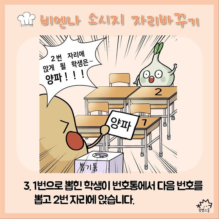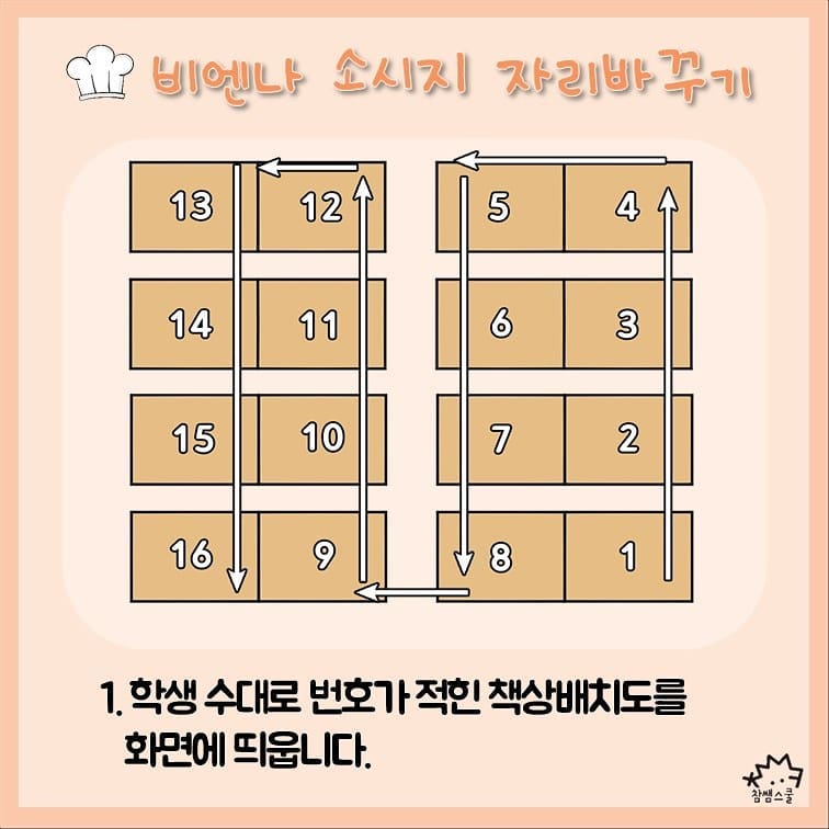 골라먹는 재미가 있는 자리바꾸기 3탄을 공개합니다!! 3탄은 🌭비엔나 소시지 자리 바꾸기! 쭉 연결되어있는 비엔나 소시지처럼 번호 순으로 뚝딱!! 바꾸는 방법도 쉽고, 난 언제 뽑힐까 두근두근하게 만들어 재미까지 있는 1석 2조의 자리를 정하는 방법이에요🙆♀️❤