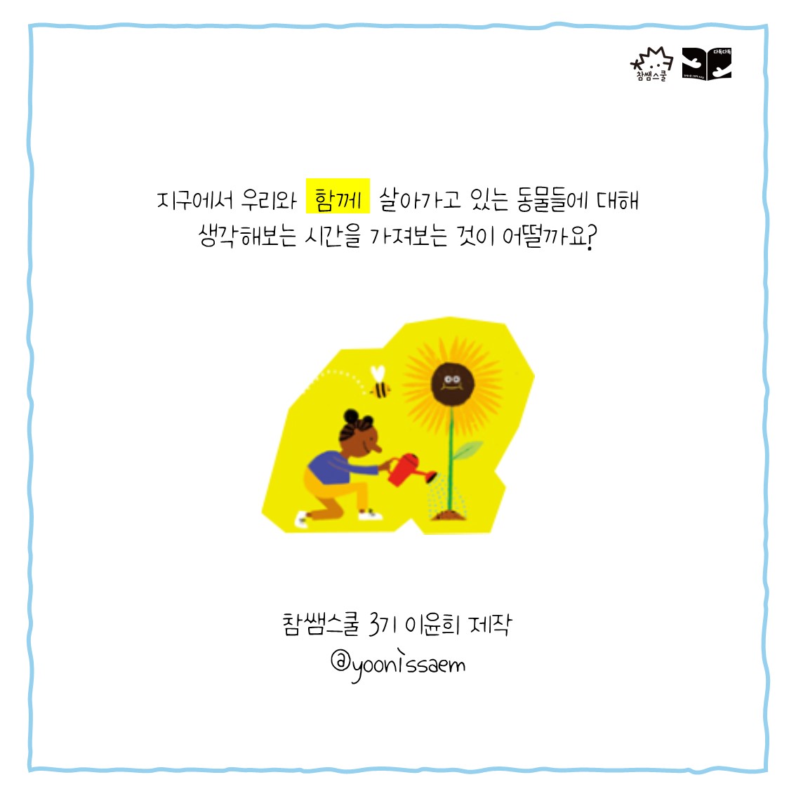 지구에서 함께 살아가는 여러 생명을 소중하게 여기는 마음을 가져요:)