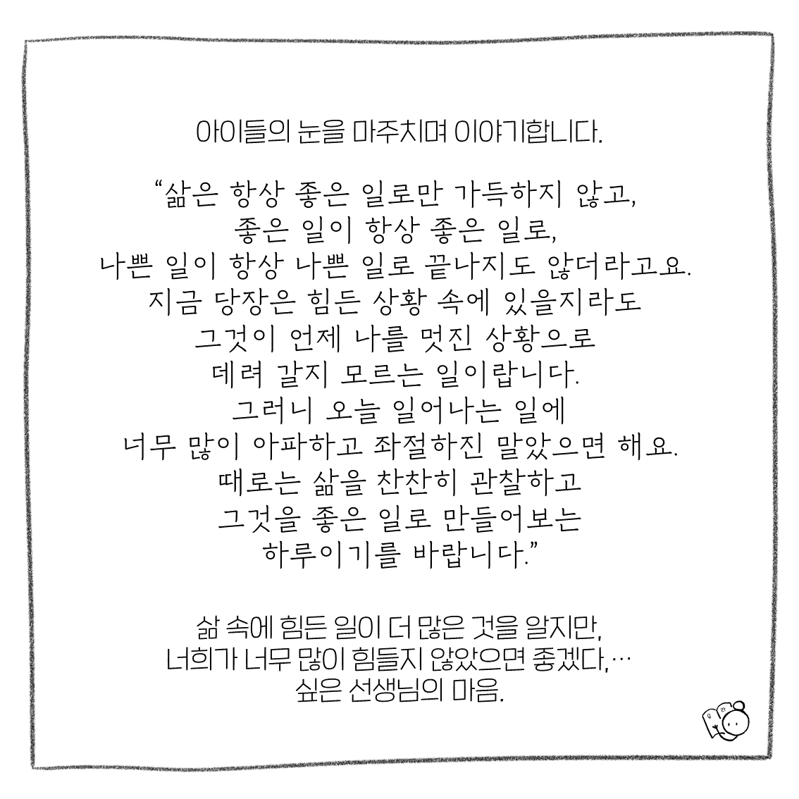 그래도 나의 아이들이 너무 많이 아파하고 힘들어하며 자라진 않았으면 하는 바람도 전합니다.
