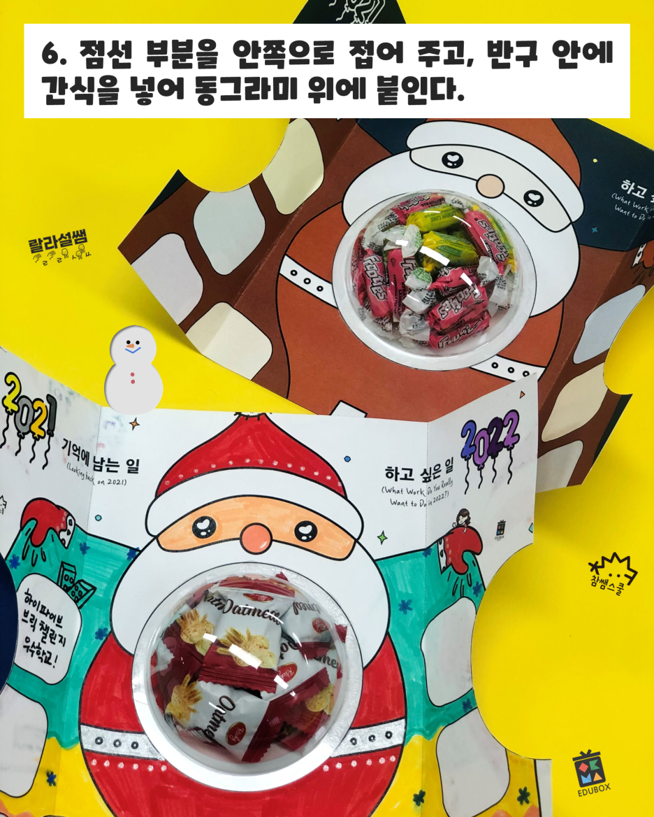 🟣 교사가 미리 만들어 둔 활동지(간식을 넣고 반구를 붙여서)에 아이들이 2021년에 기억에 남는 일과, 2022년에 하고 싶은 일 적어 보고 강화물로 활용해도 좋습니다!
