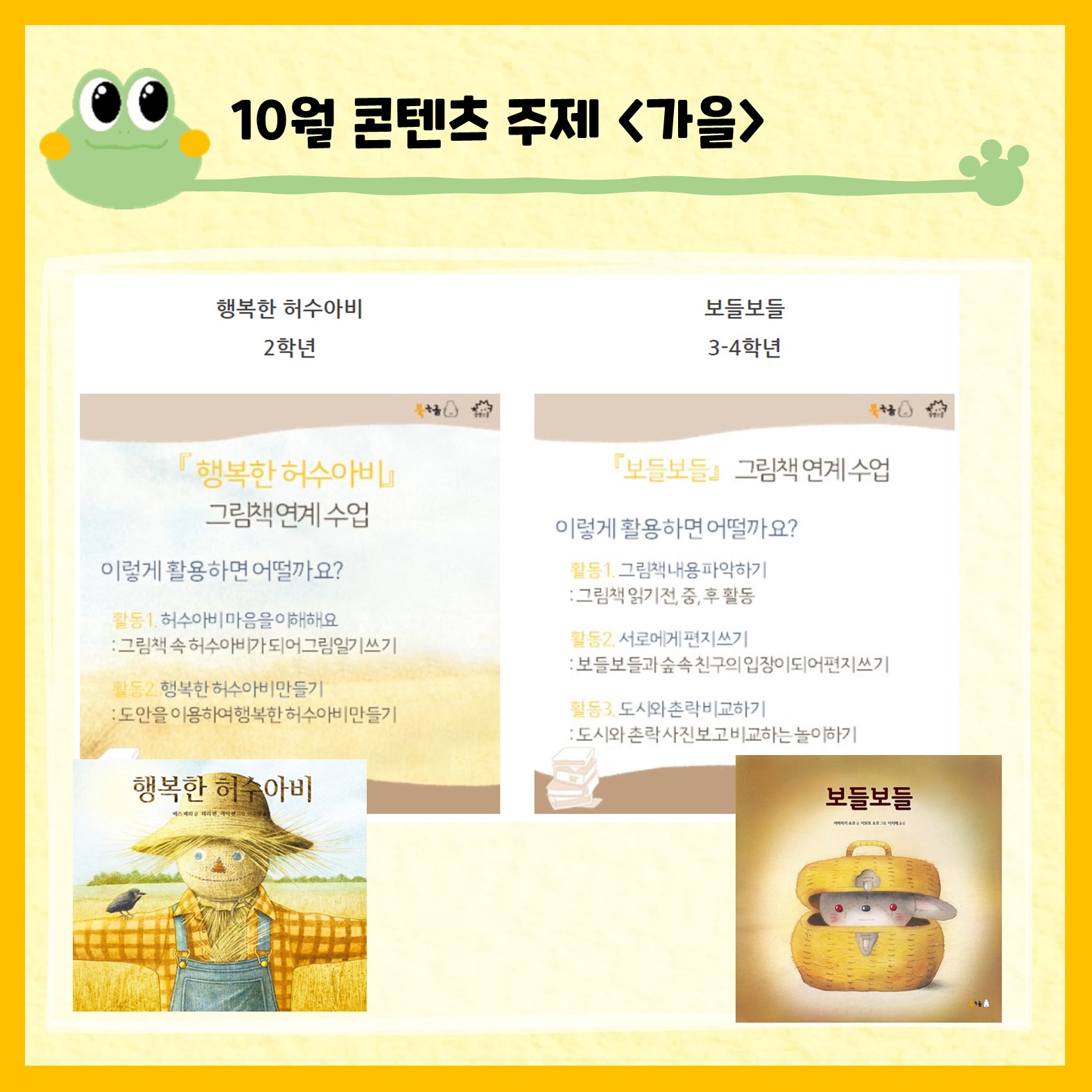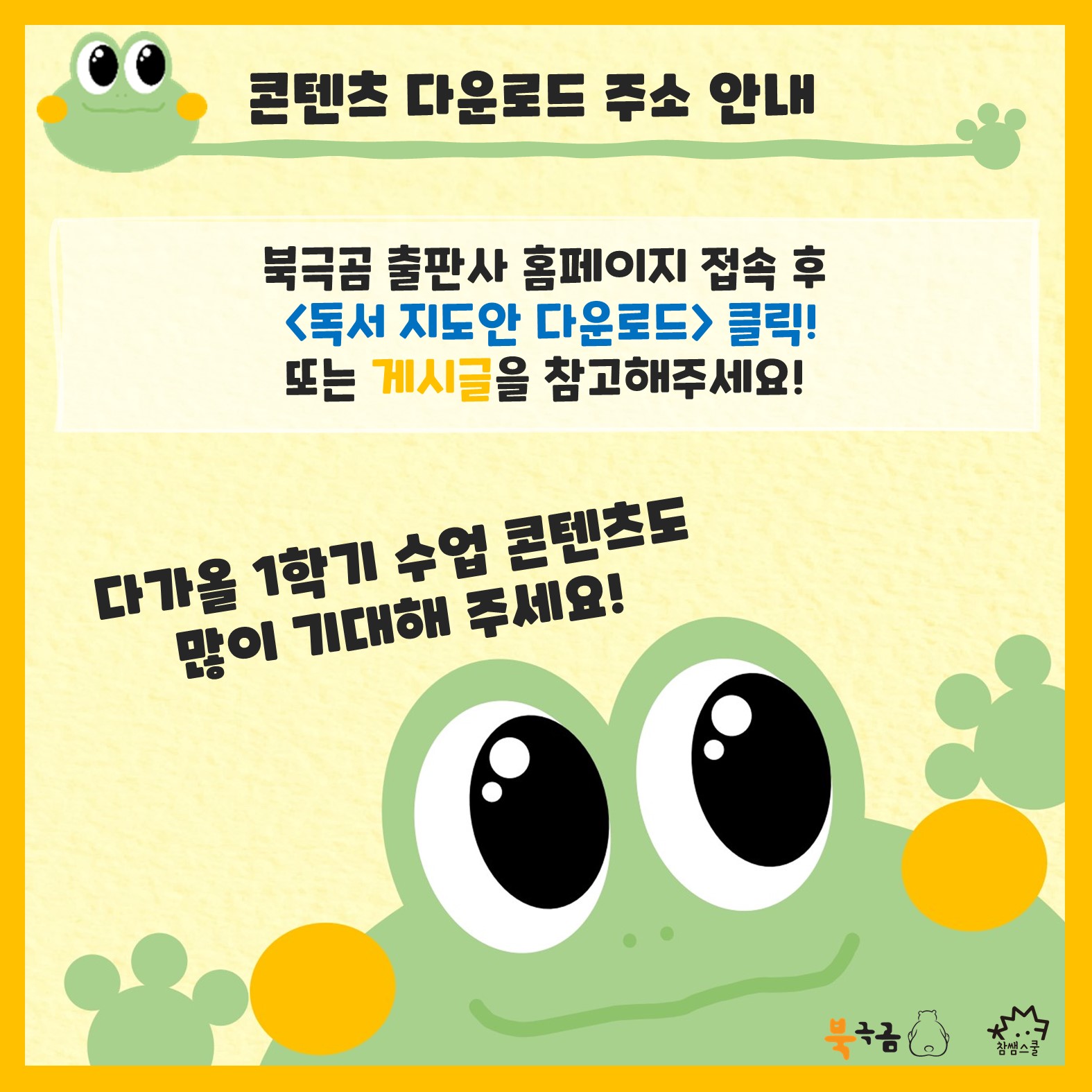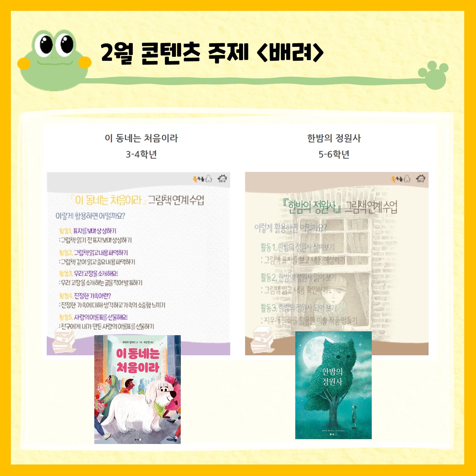기본적으로 2차시 분량의 수업으로 제작하였고 활동지와 ppt가 모두 제공됩니다. 또 코로나 시기로 인해 원격 수업을 위한 팁도 ppt에 있습니다^^ 시기가 구분되어 있지만 주제에 따라 언제든지 활용할 수 있어요! 앞으로 올라올 카드뉴스에 각 주제별 그림책 소개를 업로드할 예정이니 수업에 참고하셔도 됩니다^^ 아 참! 그리고 다가오는 1학기 그림책 콘텐츠도 곧 올라올 예정이니 많은 기대해주세요.
