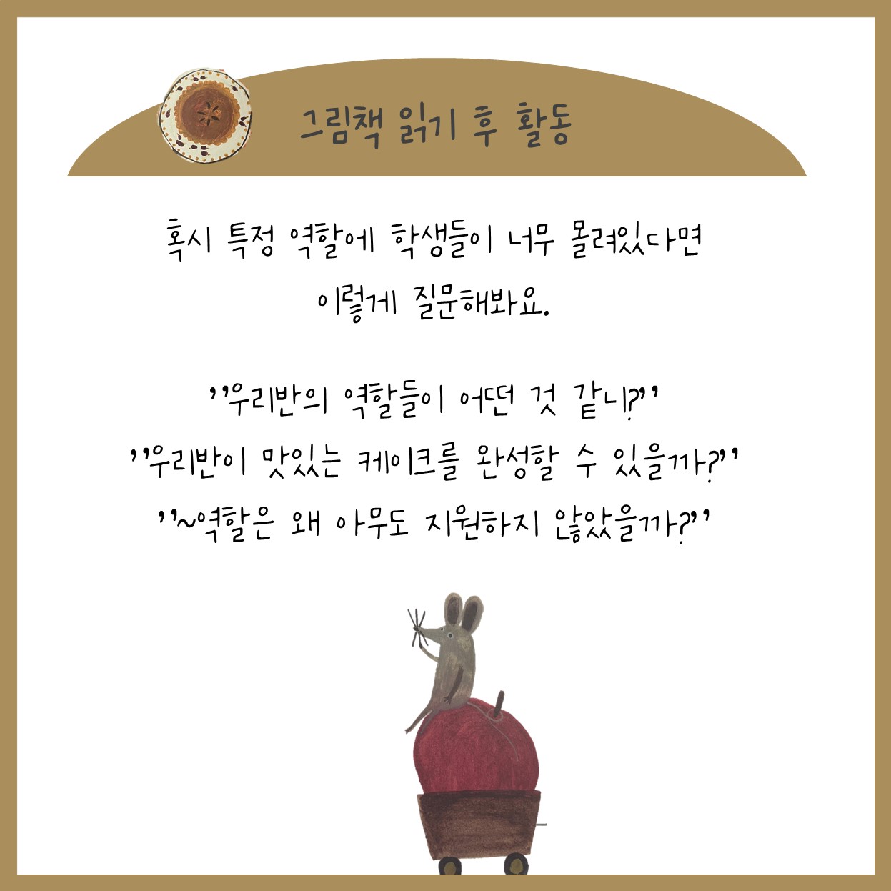 맛있는 케이크를 만들기 위해 재료를 찾아다니는 동물들의 이야기를 읽으며 행복한 우리반을 위한 나의 역할을 고민해봐요 🤗
