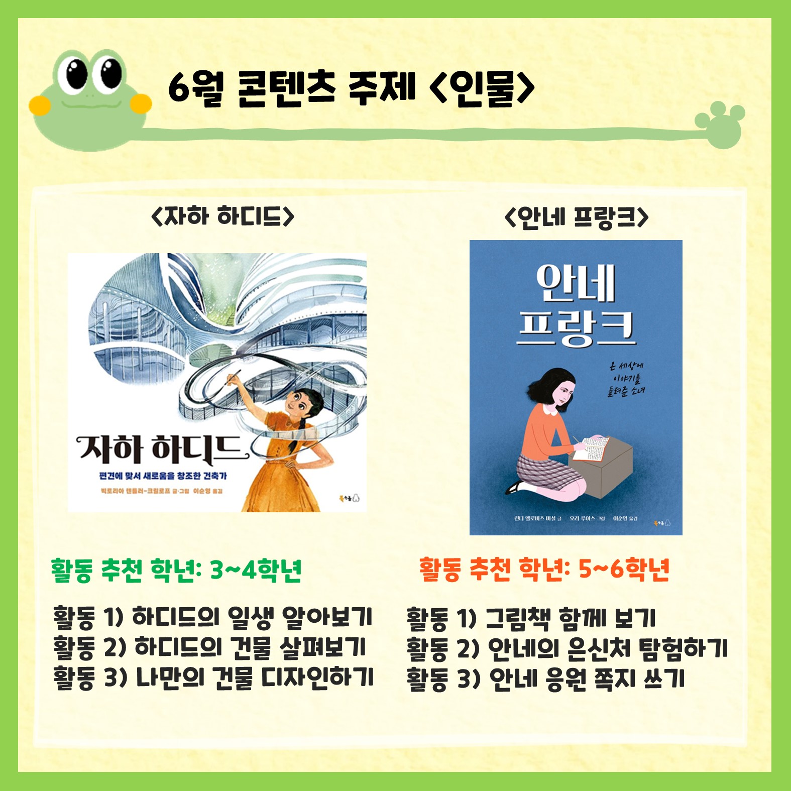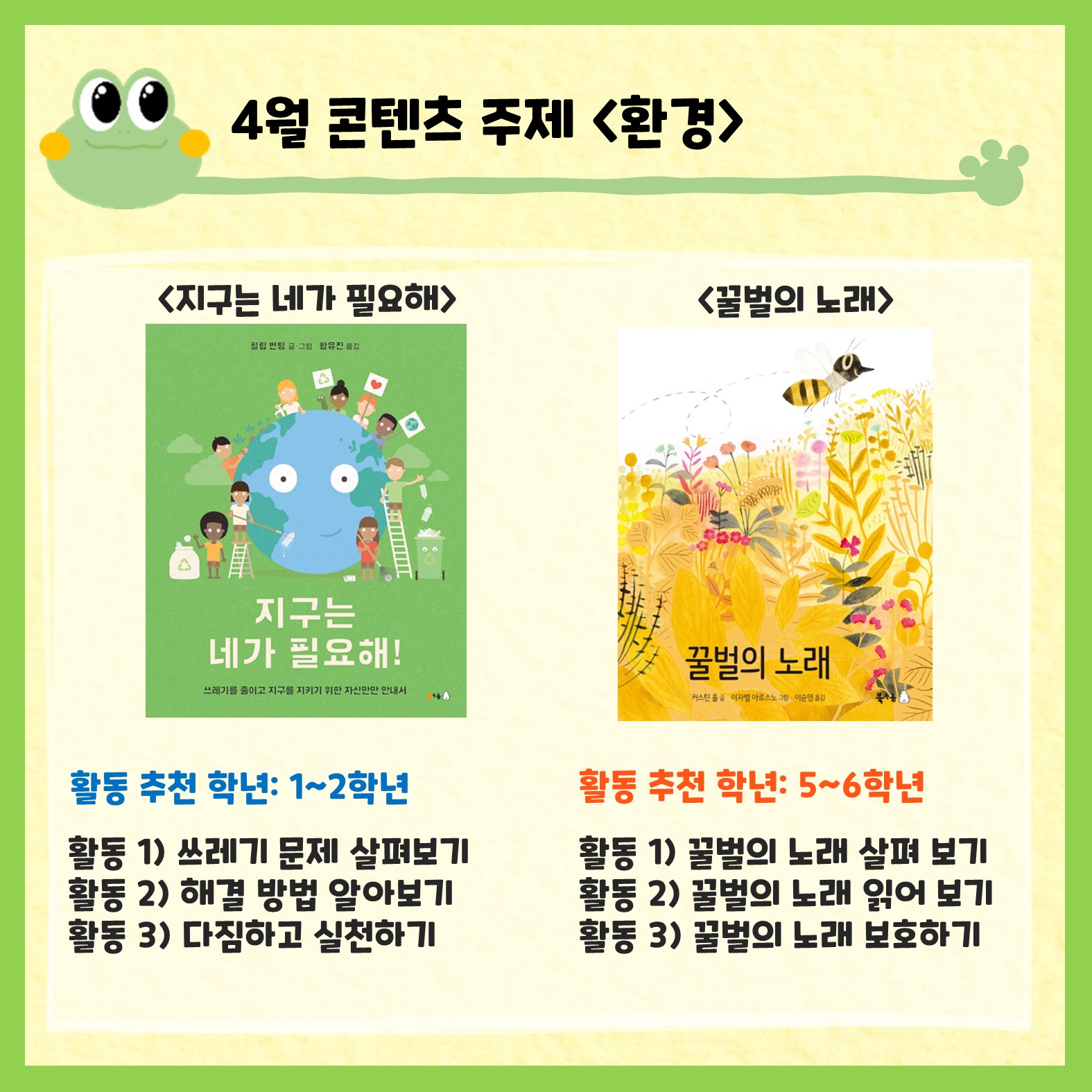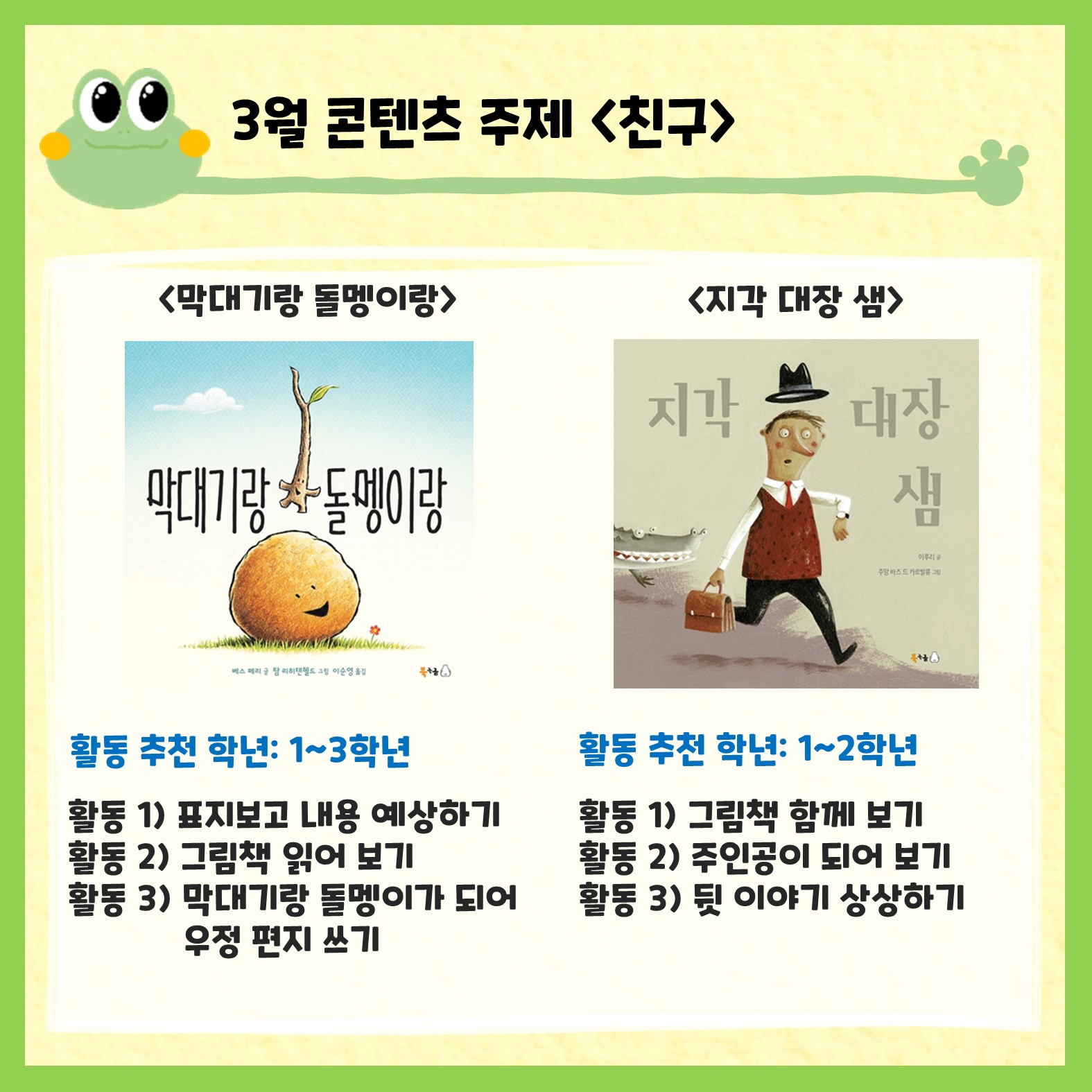북극곰 출판사에서 월별 주제를 정하고 엄선한 그림책을 가지고 1-2차시 수업으로 활용할 수 있도록 구성하였습니다. 활동별로 추천 학년과 성취기준이 있는데요. 그래도 전학년에서 활용가능하니 선생님들께서 많은 애용 바랍니다!