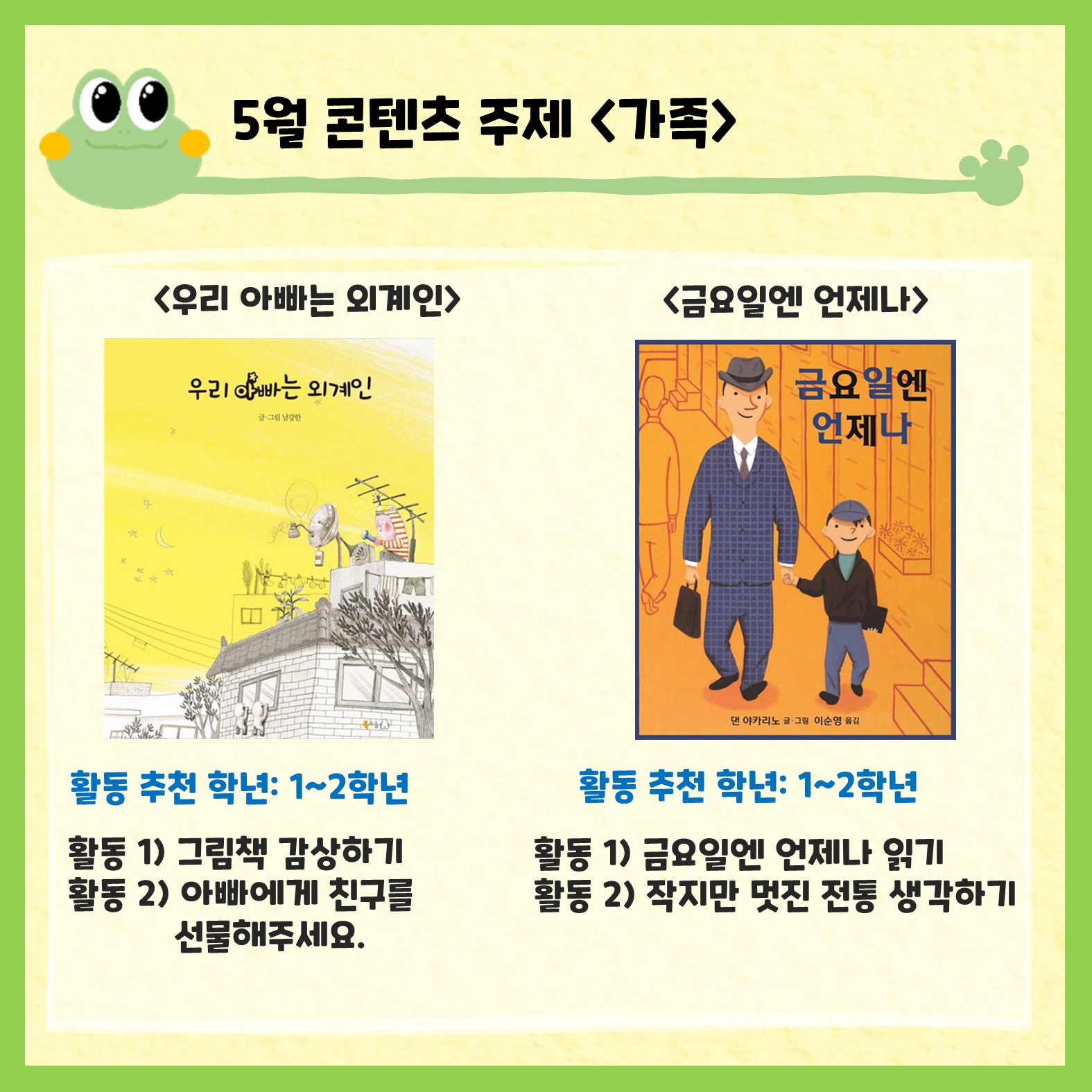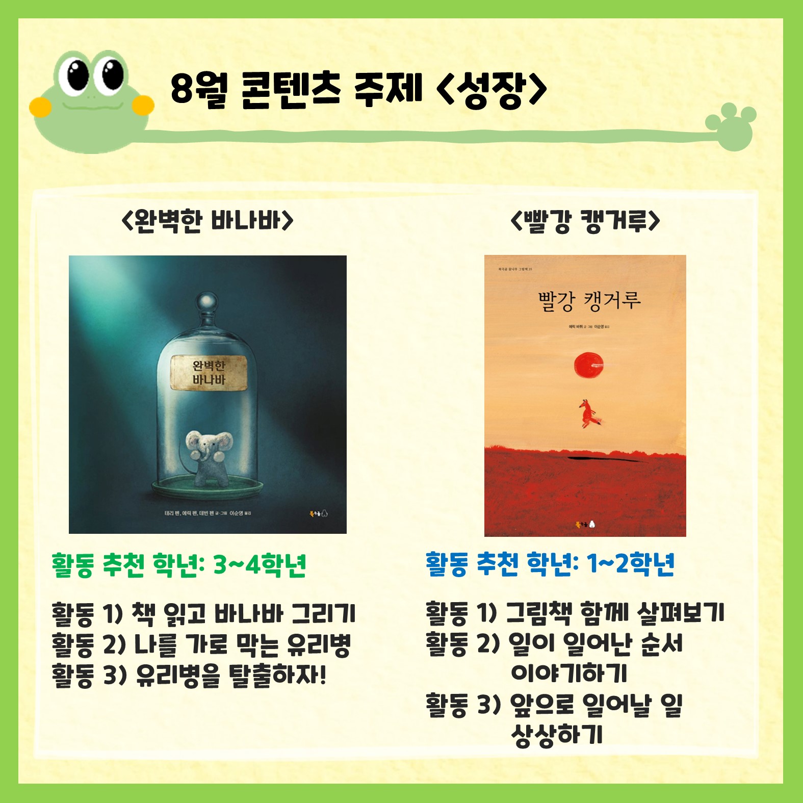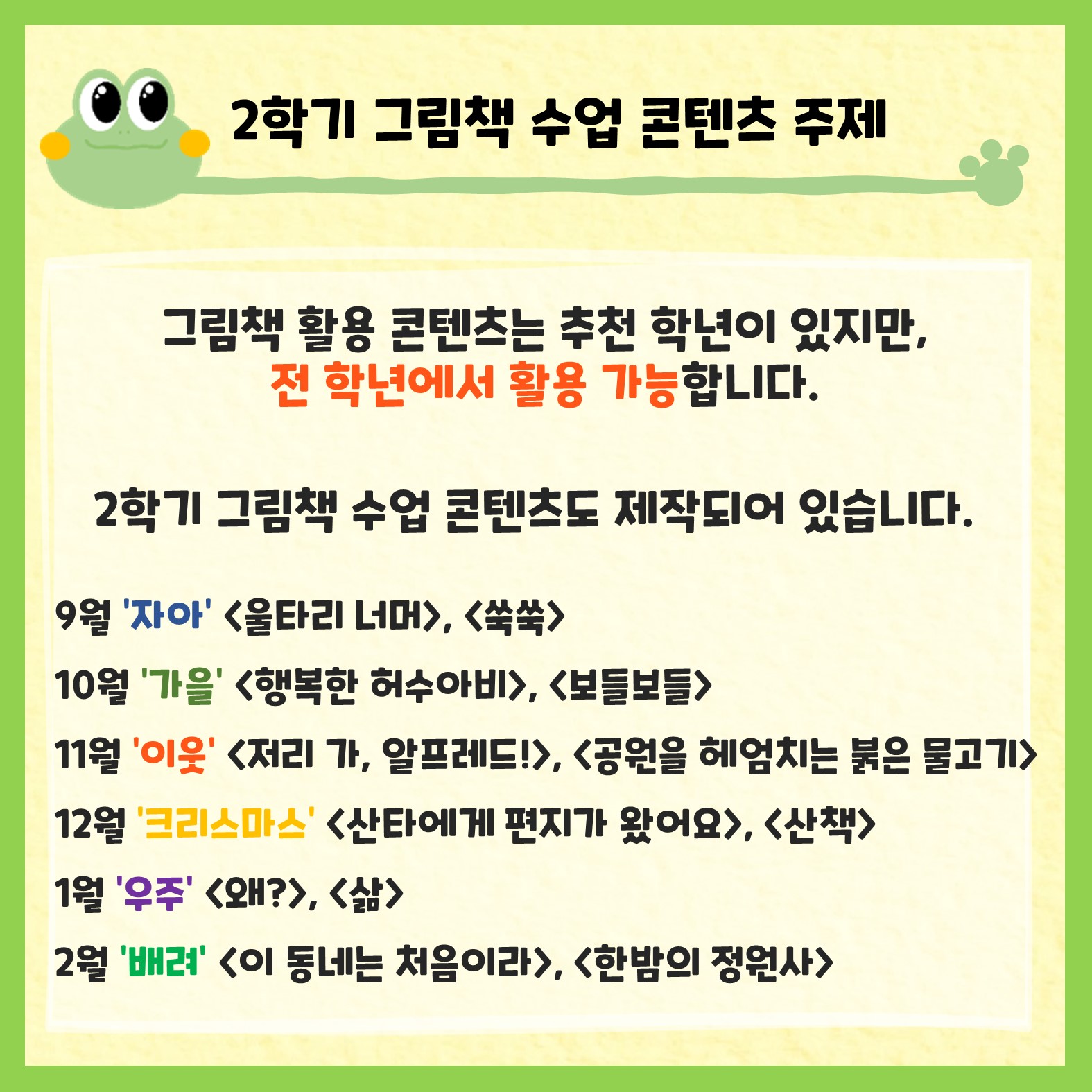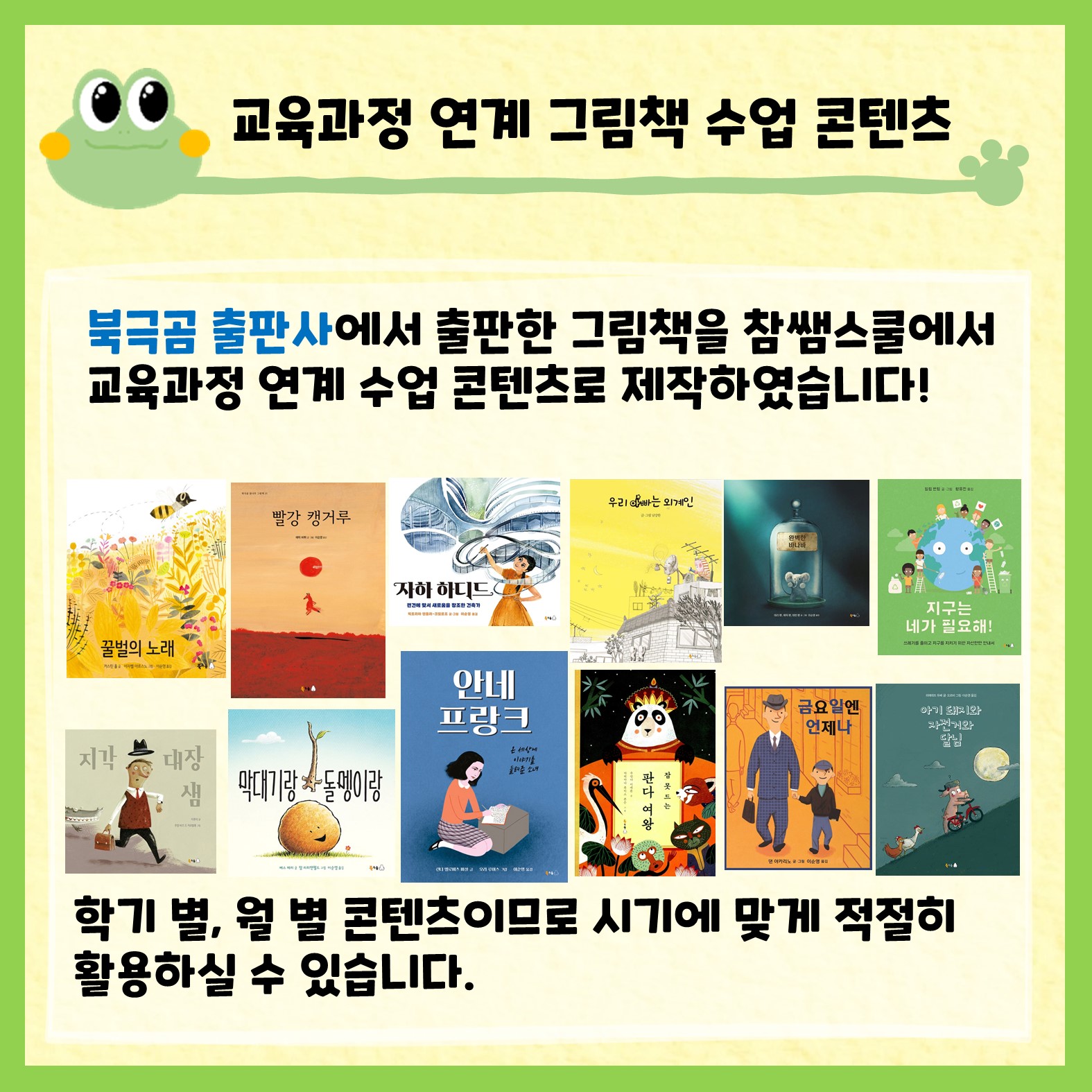 북극곰 출판사에서 월별 주제를 정하고 엄선한 그림책을 가지고 1-2차시 수업으로 활용할 수 있도록 구성하였습니다. 활동별로 추천 학년과 성취기준이 있는데요. 그래도 전학년에서 활용가능하니 선생님들께서 많은 애용 바랍니다!
