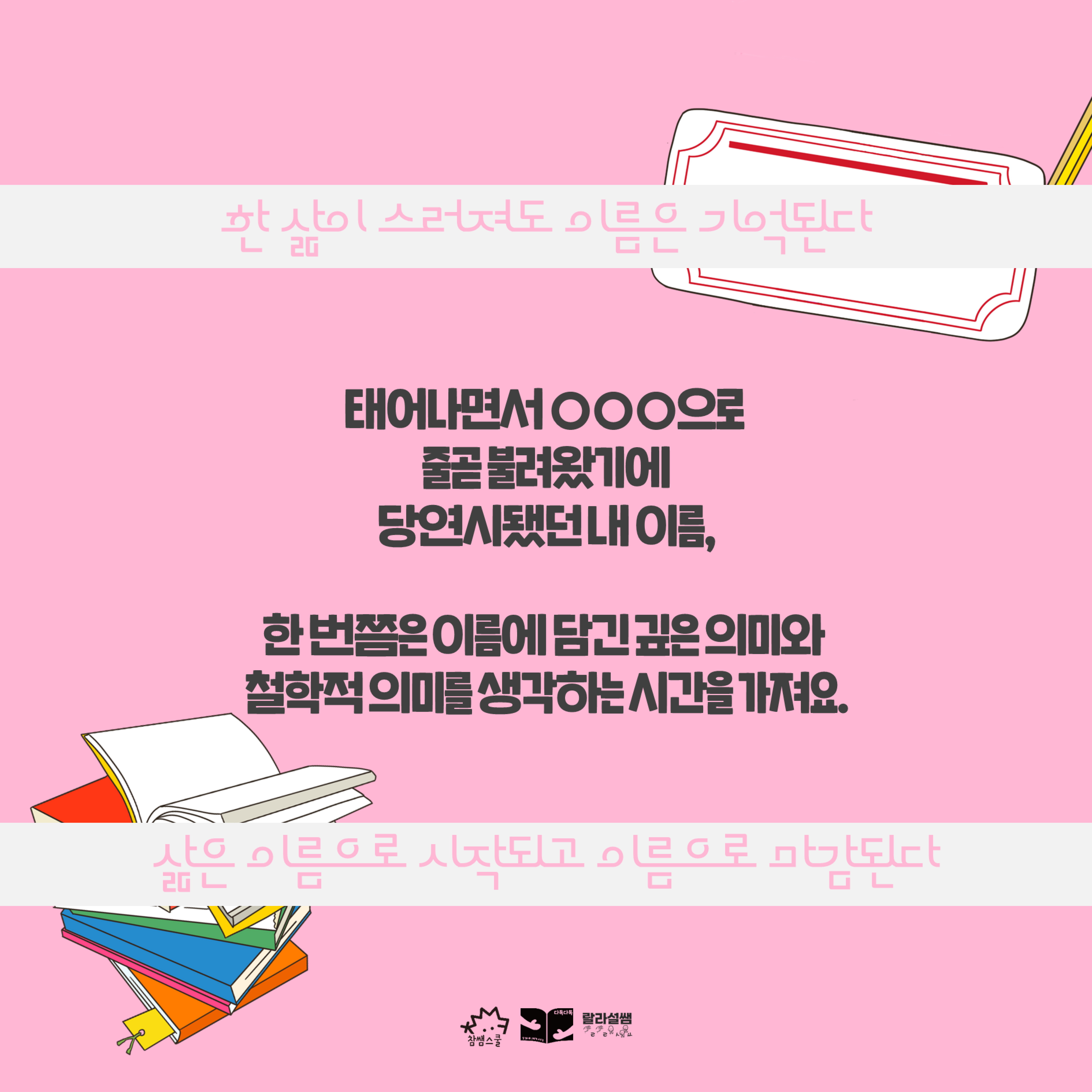 태어나면서 ○○○으로 줄곧 불려왔기에 당연시됐던 내 이름, 한 번쯤은 이름에 담긴 깊은 의미와 철학적 의미를 생각하는 시간을 가져요.