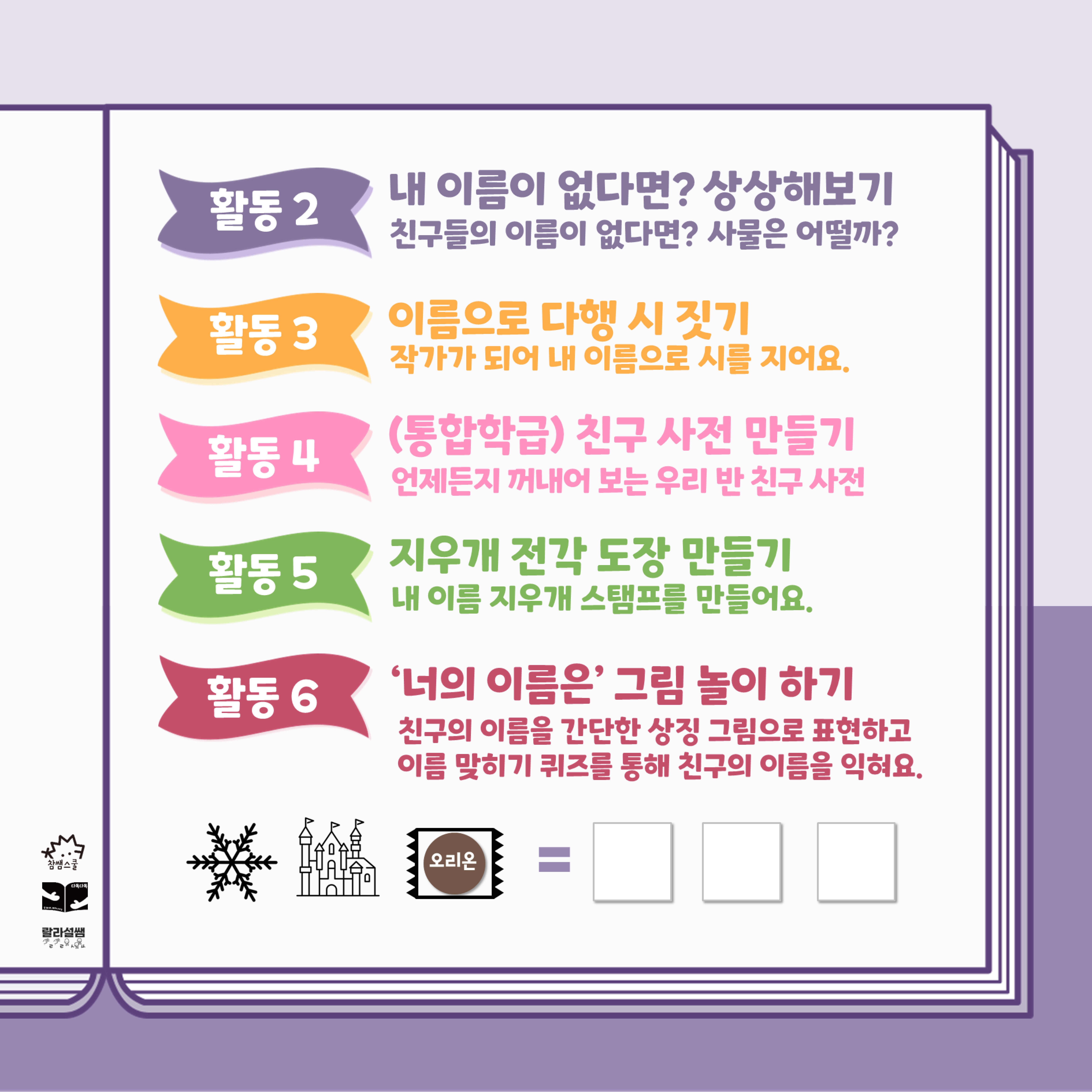 ✏️ 그림책 ‘내 이름’과 연계할 수 있는 활동을 소개합니다(활동 순서 아님).