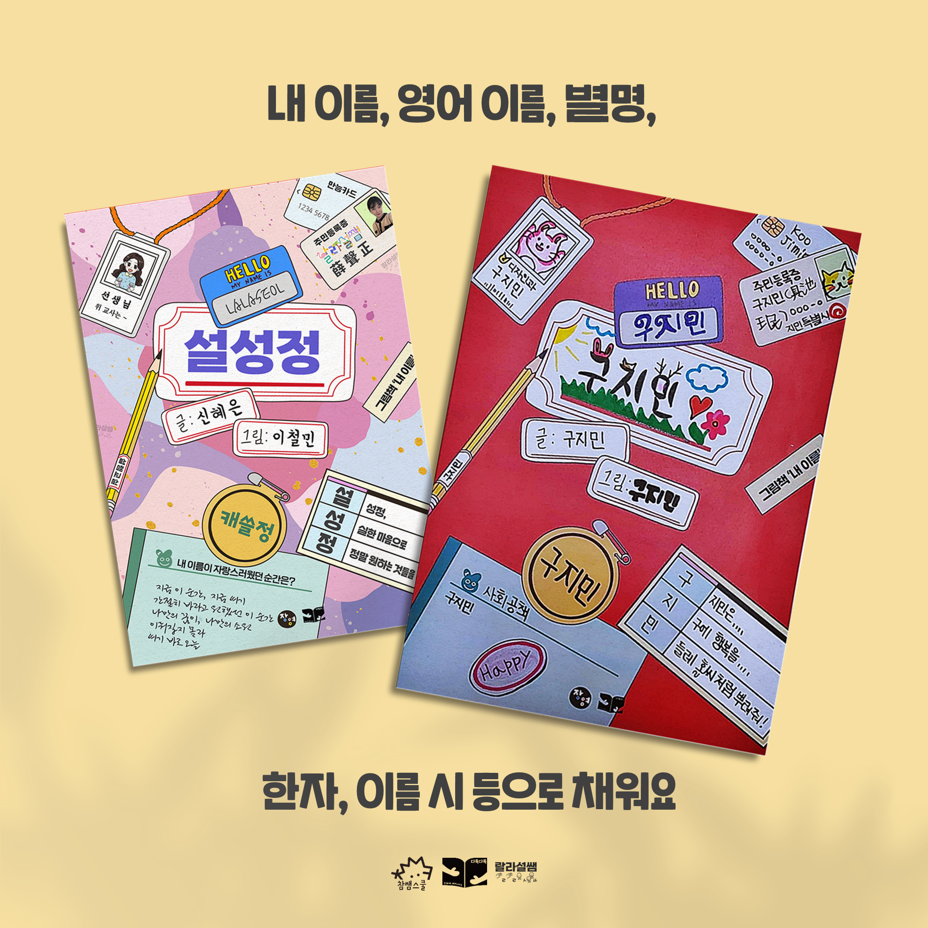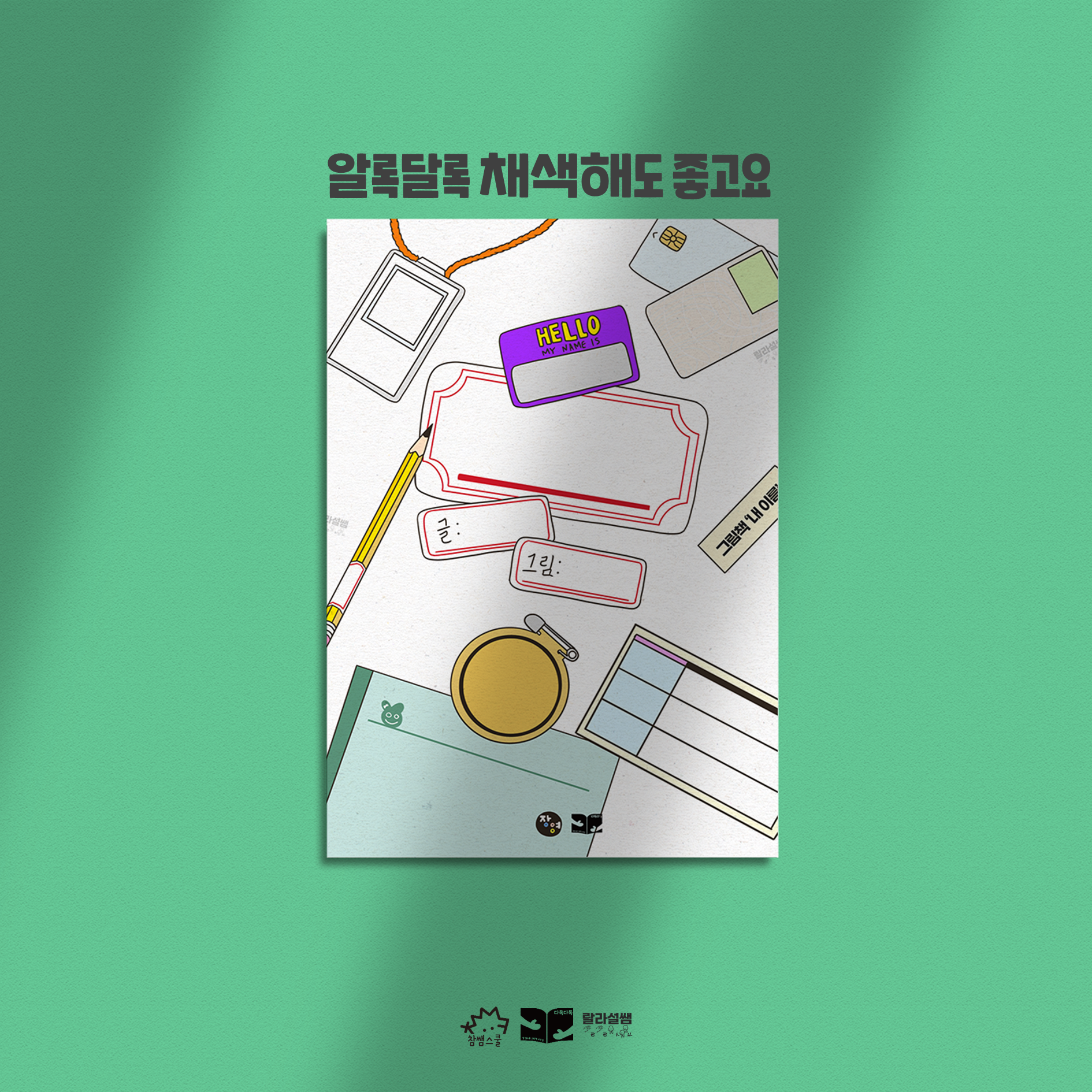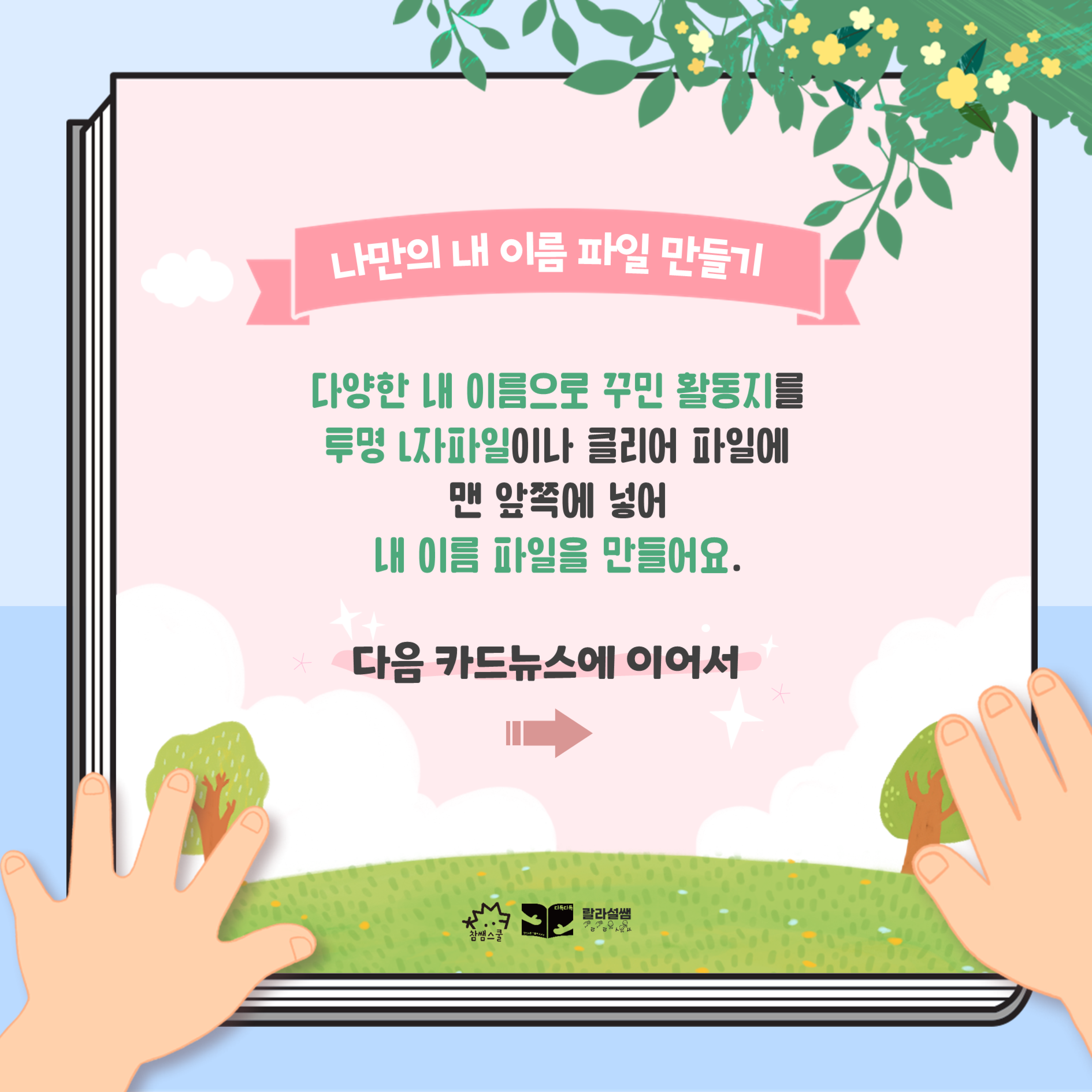 💖 내 이름 그림책 작가님들의 이름도 채워보고, 내 이름, 영어 이름, 별명, 한자. 이름 시, 미래의 직업, 내 캐릭터 등 다양한 나로 채워봅시다. 이렇게 꾸민 표지를 투명 L자 파일이나 클리어 파일 맨 앞쪽에 넣어 ‘내 이름 파일’을 만들어요!