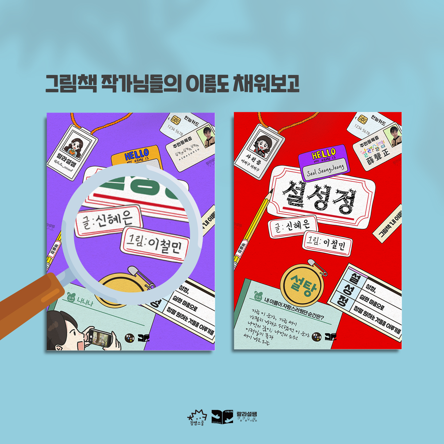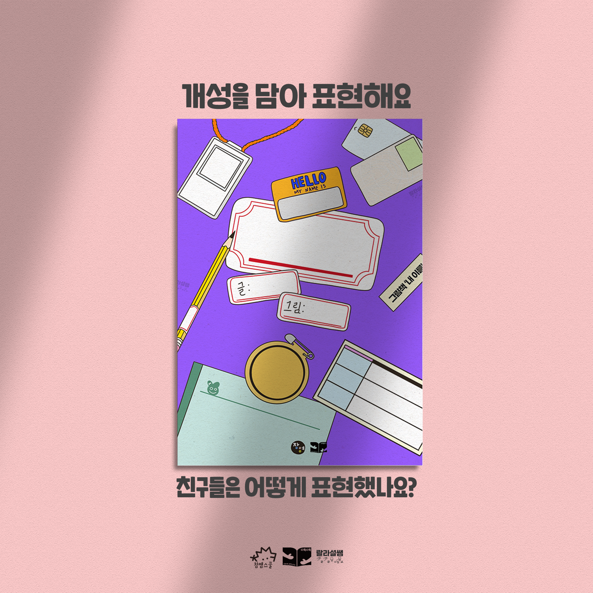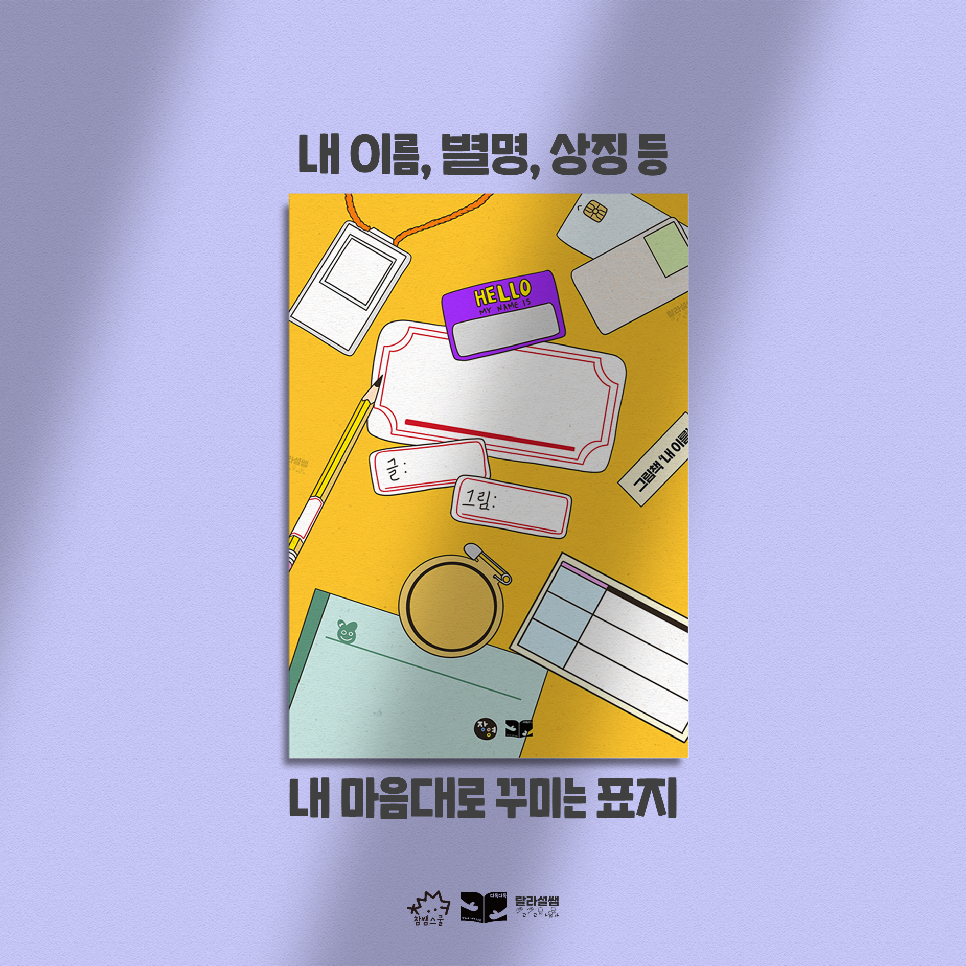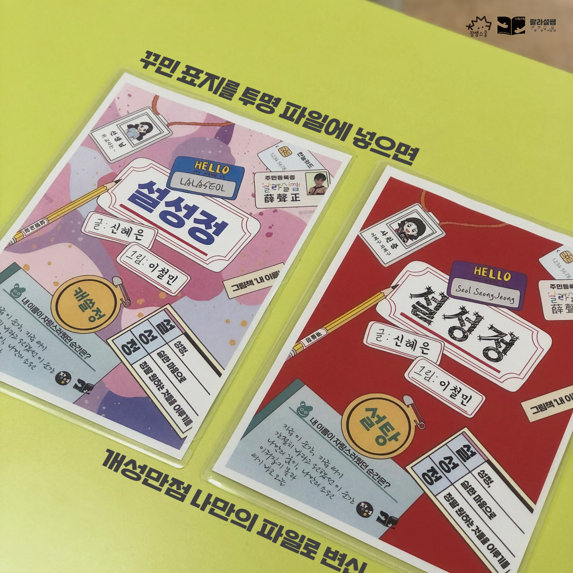 💖 내 이름 그림책 작가님들의 이름도 채워보고, 내 이름, 영어 이름, 별명, 한자. 이름 시, 미래의 직업, 내 캐릭터 등 다양한 나로 채워봅시다. 이렇게 꾸민 표지를 투명 L자 파일이나 클리어 파일 맨 앞쪽에 넣어 ‘내 이름 파일’을 만들어요!
