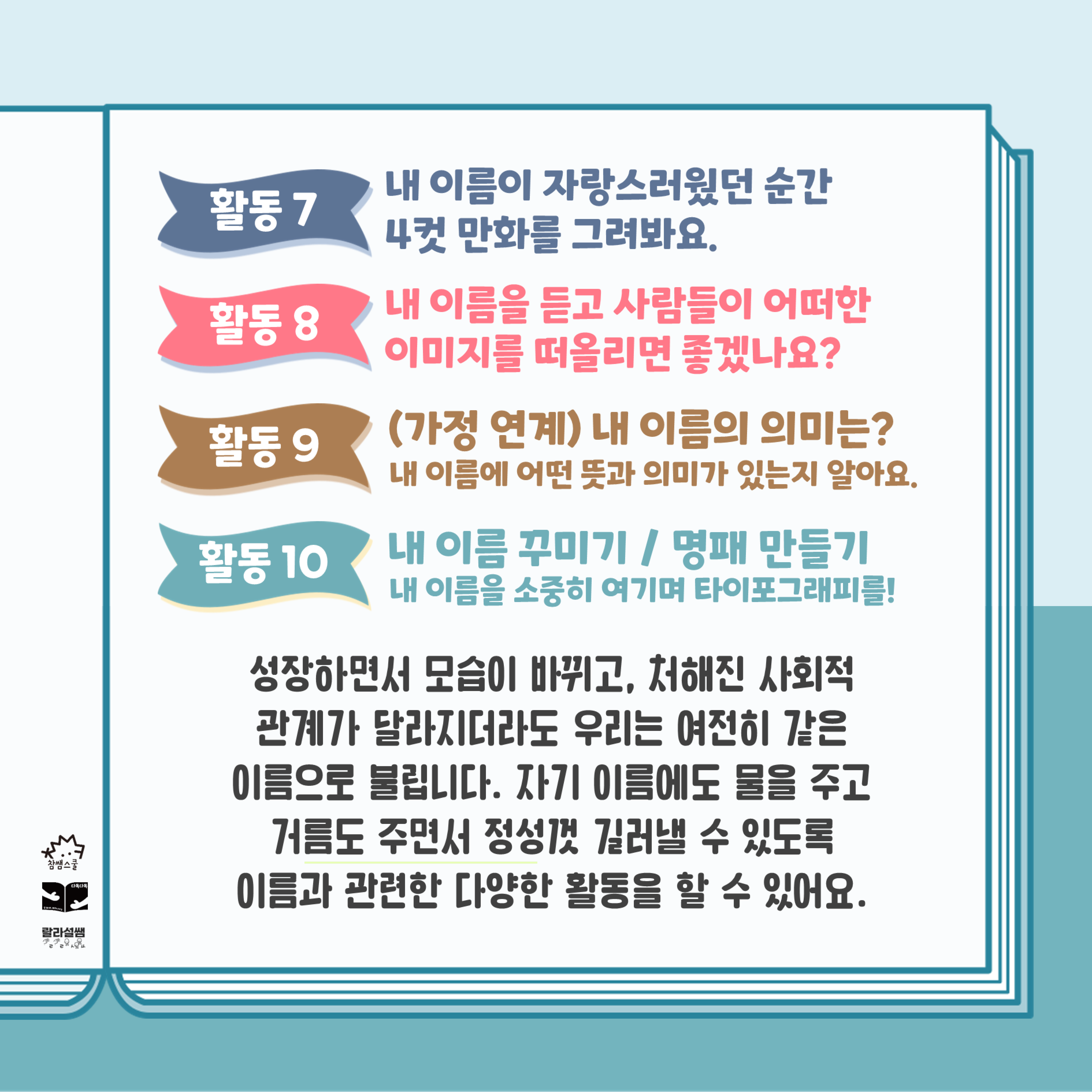 성장하면서 모습이 바뀌고 처해진 사회적 관계가 달라지더라도 우리는 여전히 같은 이름으로 불립니다. 자기 이름에도 물을 주고 거름도 주면서 정성껏 길러낼 수 있도록 이름과 관련한 다양한 활동을 할 수 있어요.