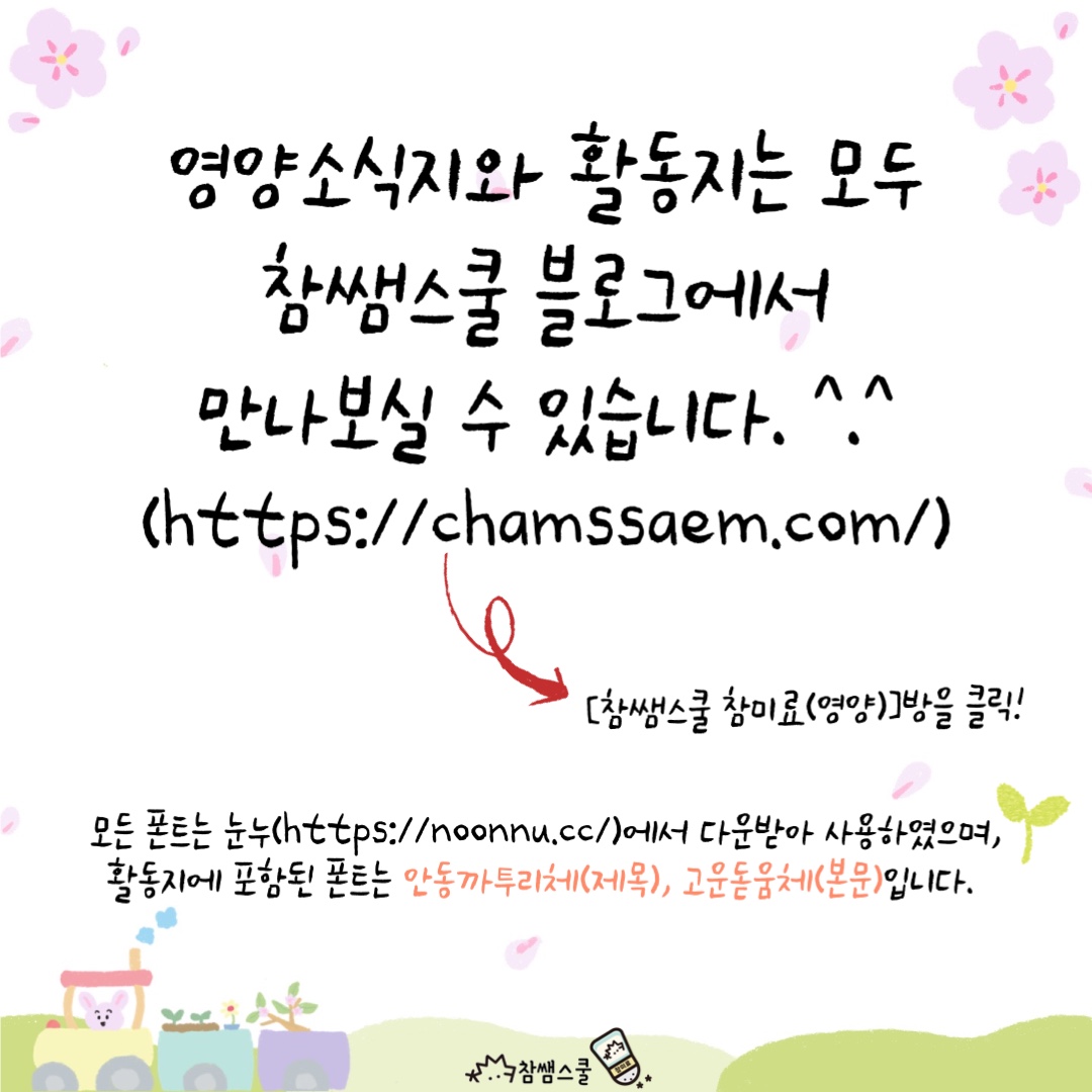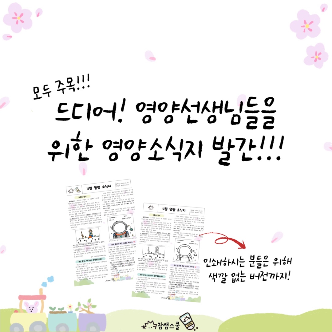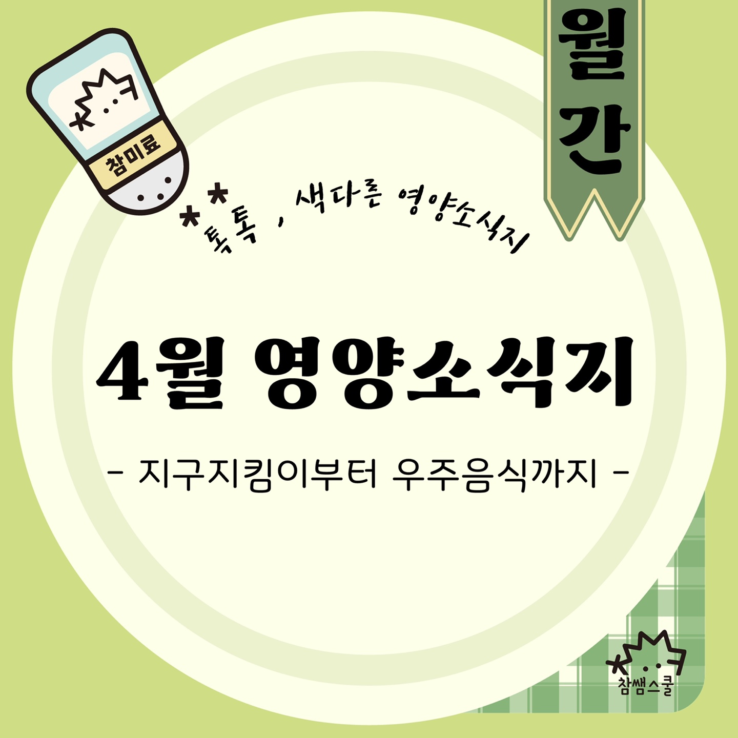 다들 3월 어떻게 보내셨나요? 춥고 긴 겨울을 지나 봄이 오는 소리도 듣지 못하고 정신없이 달려오셨을 우리 영양선생님들을 위해 참미료에서 첫 월간 영양소식지를 만들었습니다. 🐥🌿