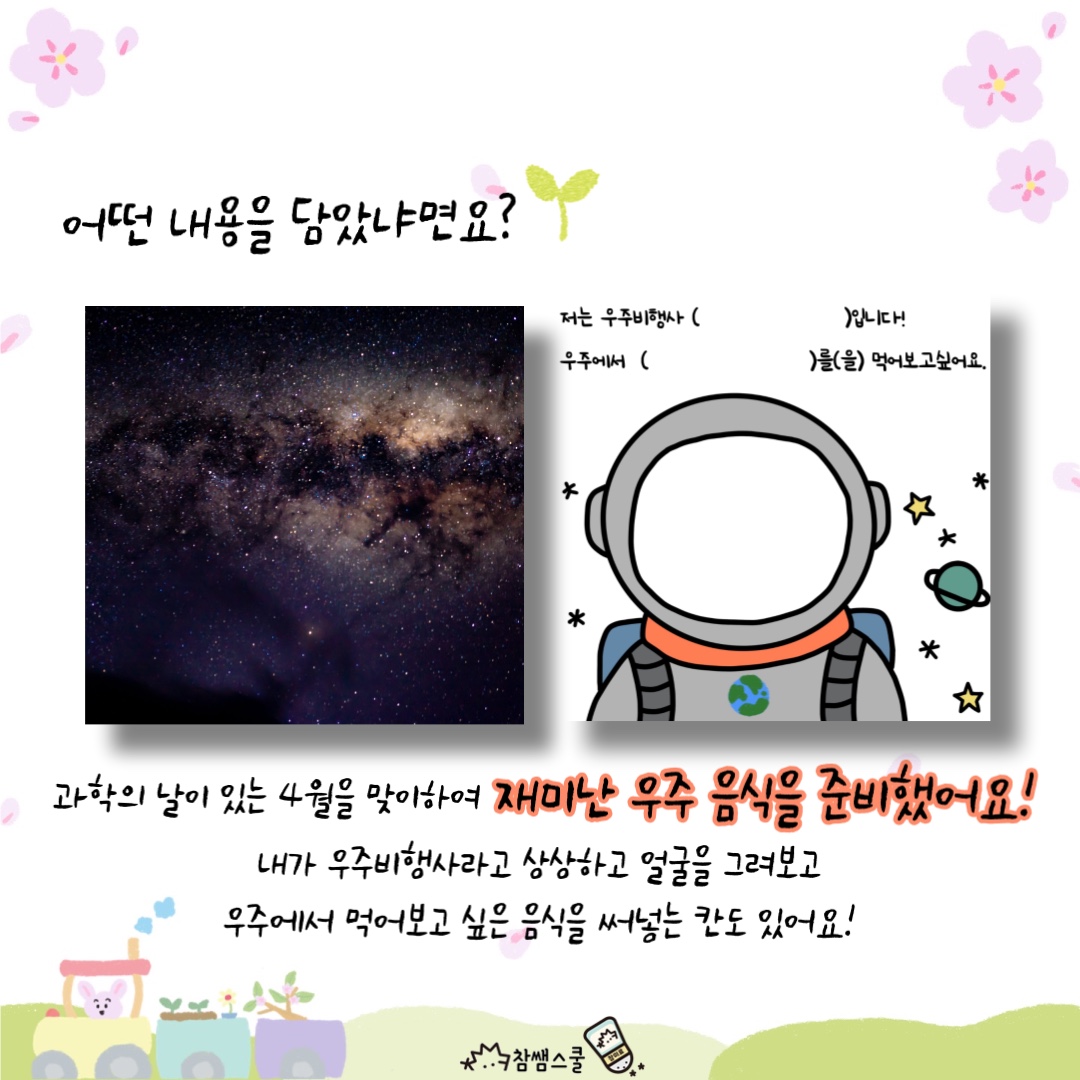 4월의 절기와 더불어 과학의 날이 있는 달을 맞이해 우주 음식에 대한 내용을 담았어어요.