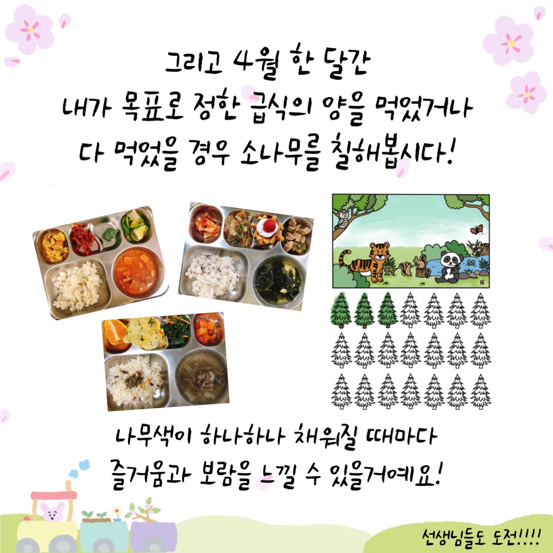 대부분 학교가 4월 한 달간 21일 급식을 먹게되는데 4월 한 달만큼은 내가 목표로 정한 급식 양 또는 다 먹기를 목표로 정해 성공했을 경우 소나무를 색칠해보아요.