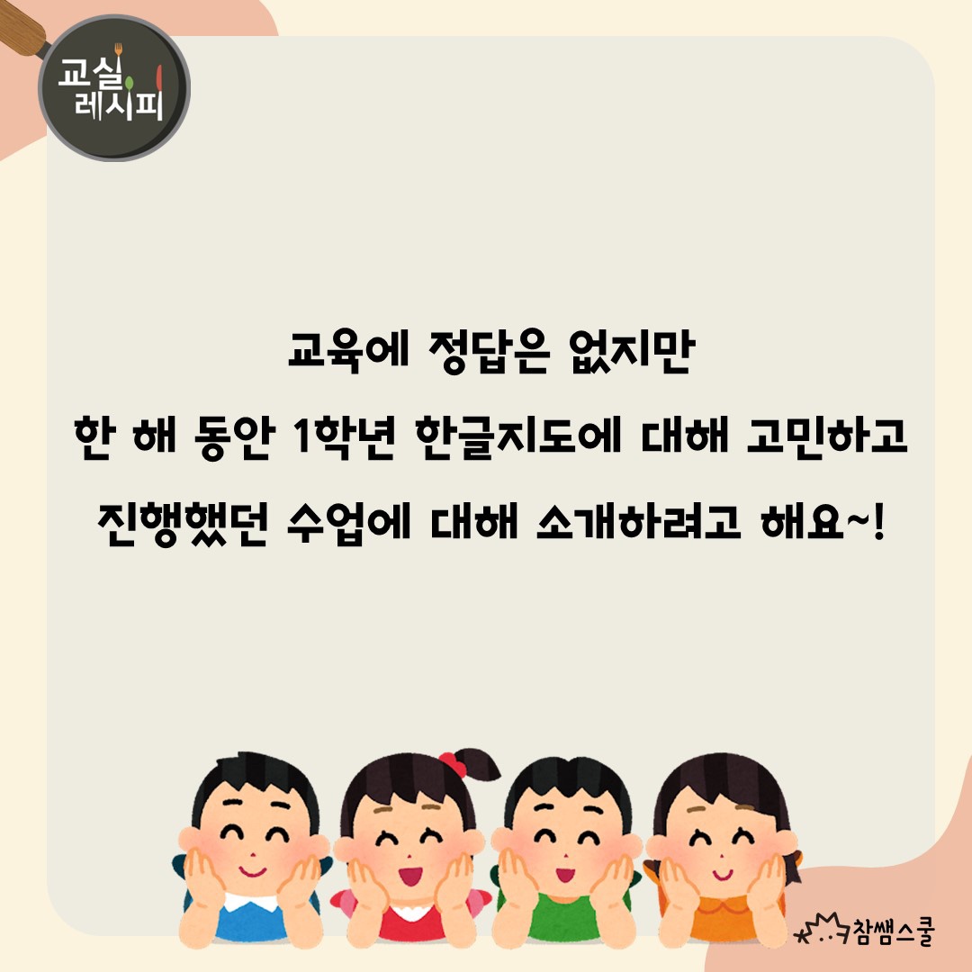 작년 한 해 동안 슬슬쌤이 1학년 친구들과 함께하며 수업한 과정을 소개합니다~~ 약 3달의 과정을 최대한 담아내고자 노력했어요. 1학년 친구들 외에도 한글 미해득 학생에게도 도움이 되길 바랍니다!