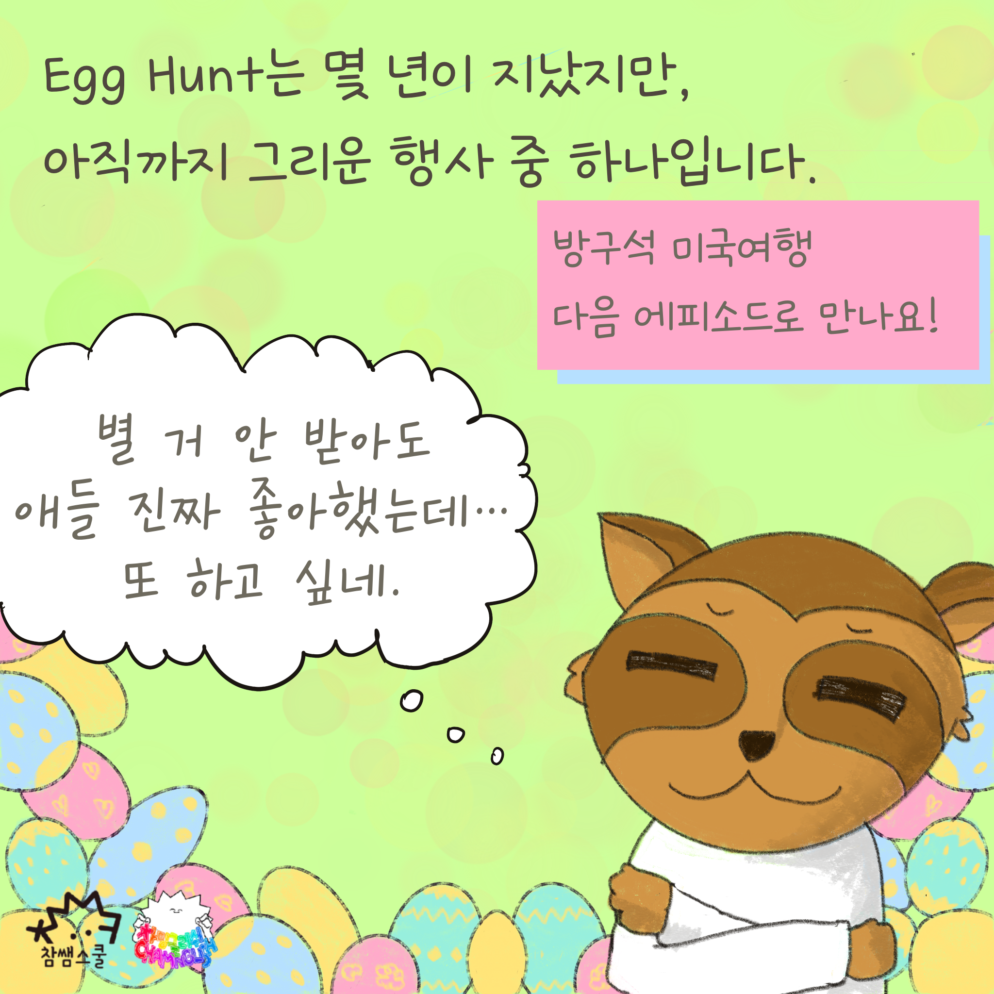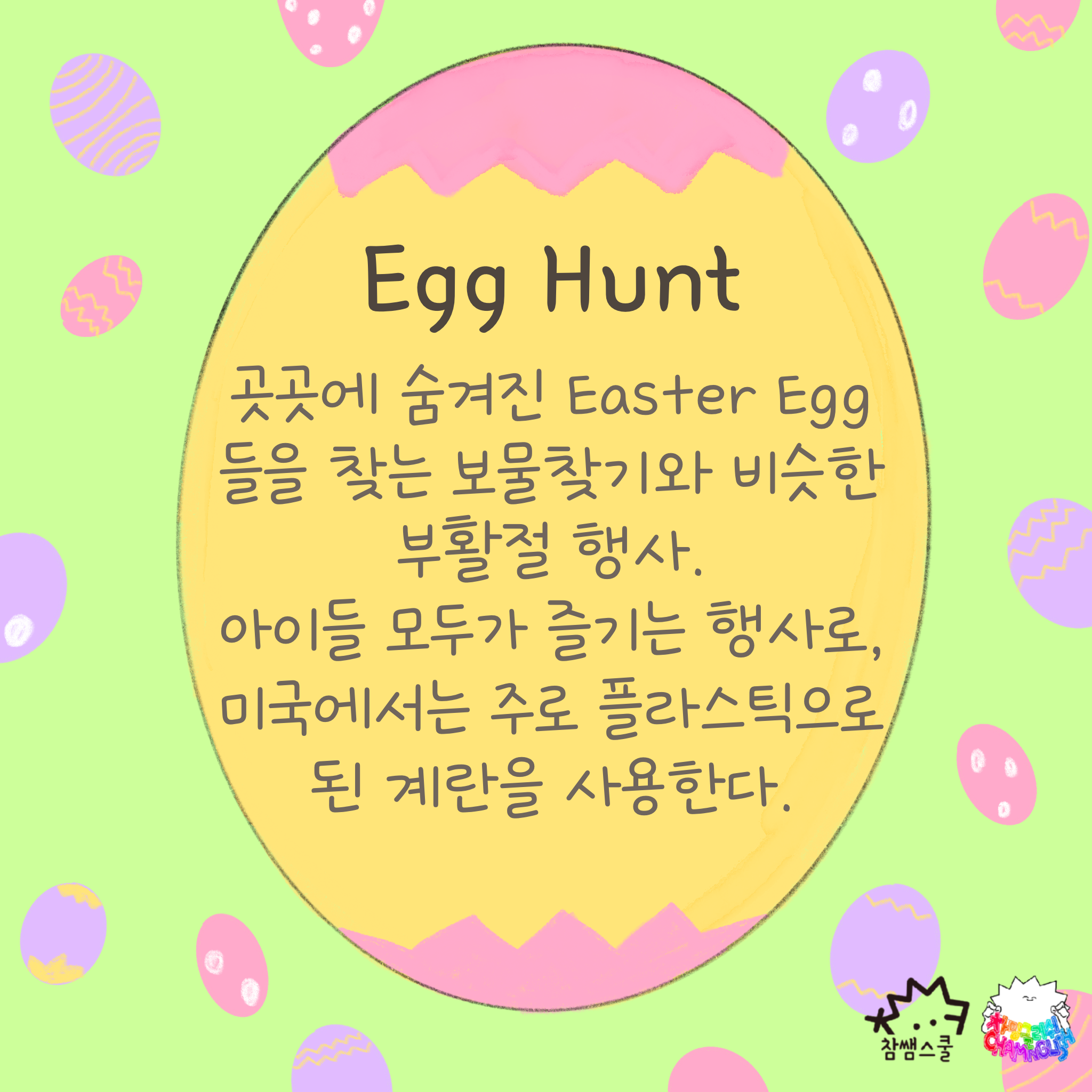 방구석 미국여행, 이번 시간에는 지난 번에 이어 '하슨생'@teecher_ha 님께서 '부활절'에 대한 재미있는 에피소드를 준비해주셨습니다. 이번에는 아이들이 부활절에서 하는 대표적인 활동인 'Egg Hunt' 에 대해 안내해주셨습니다.