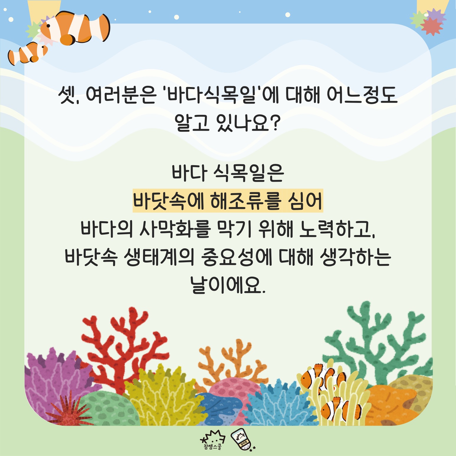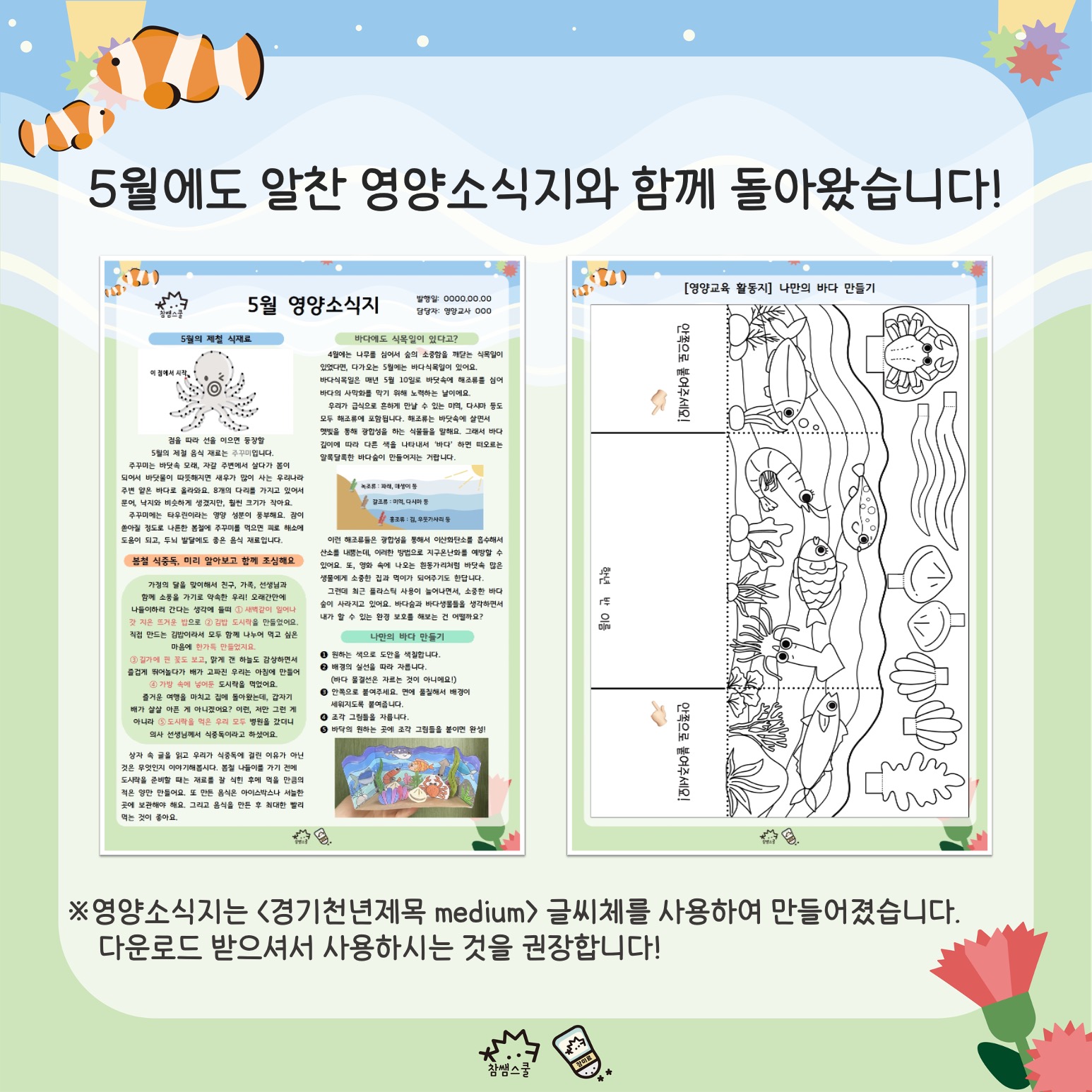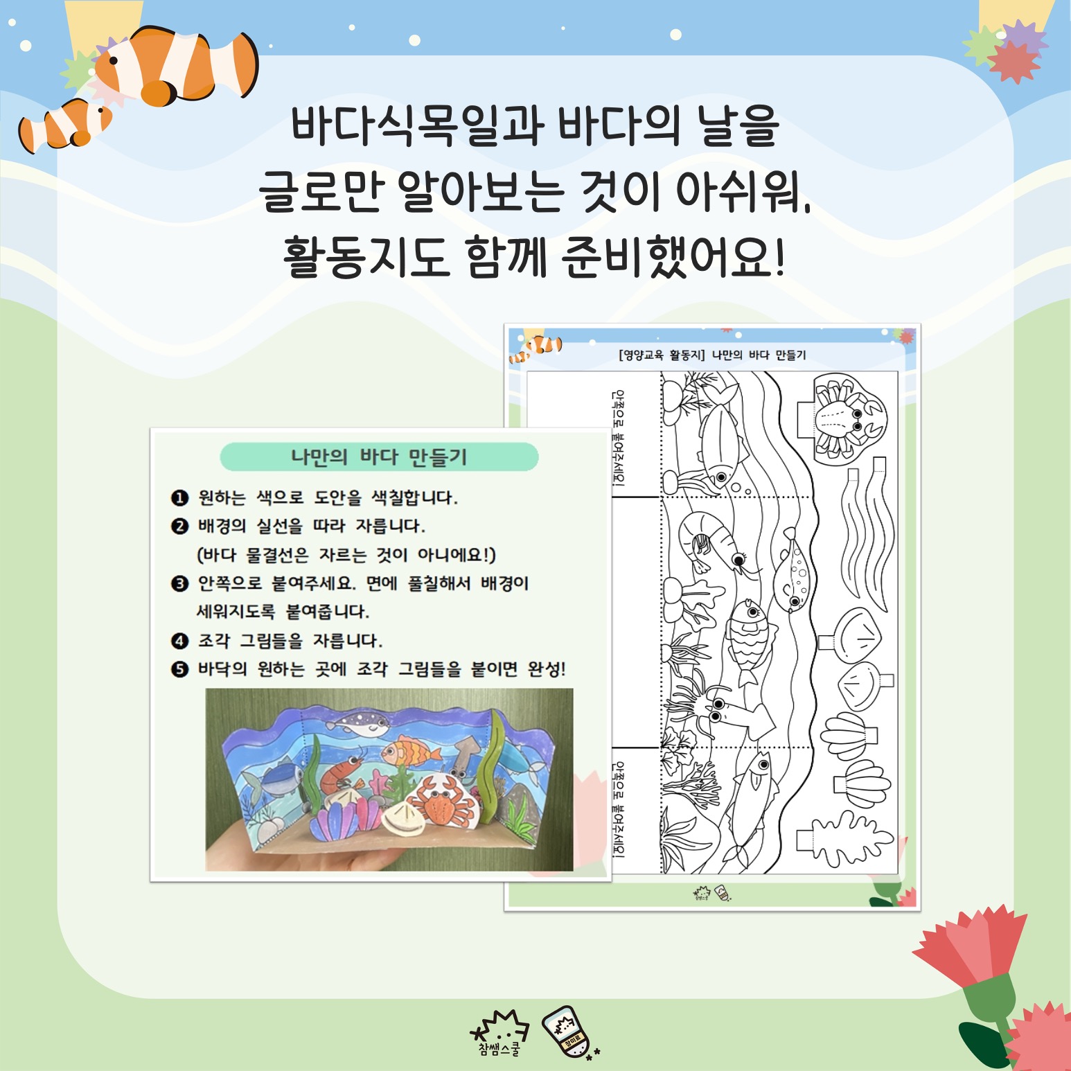 특히 바다식목일(5월 10일), 바다의 날(5월 31일)을 기념하며 학교급식과 연계할 수 있는 활동지도 함께 구성했어요.
