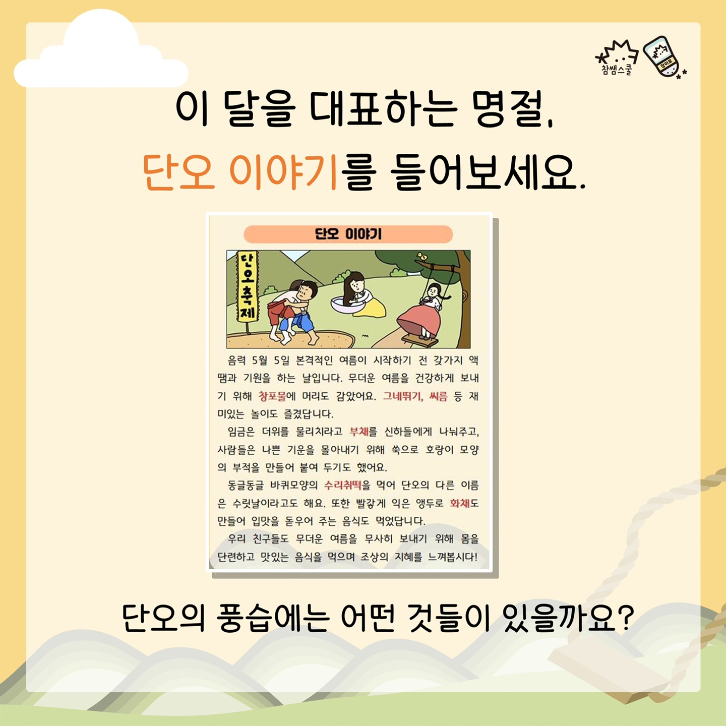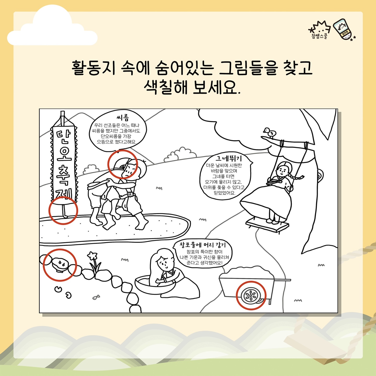 단오날에 선물하던 물건들과 나눠먹던 음식들이 숨겨져 있으니, 두눈을 크게 뜨고 찾아보세요🔍