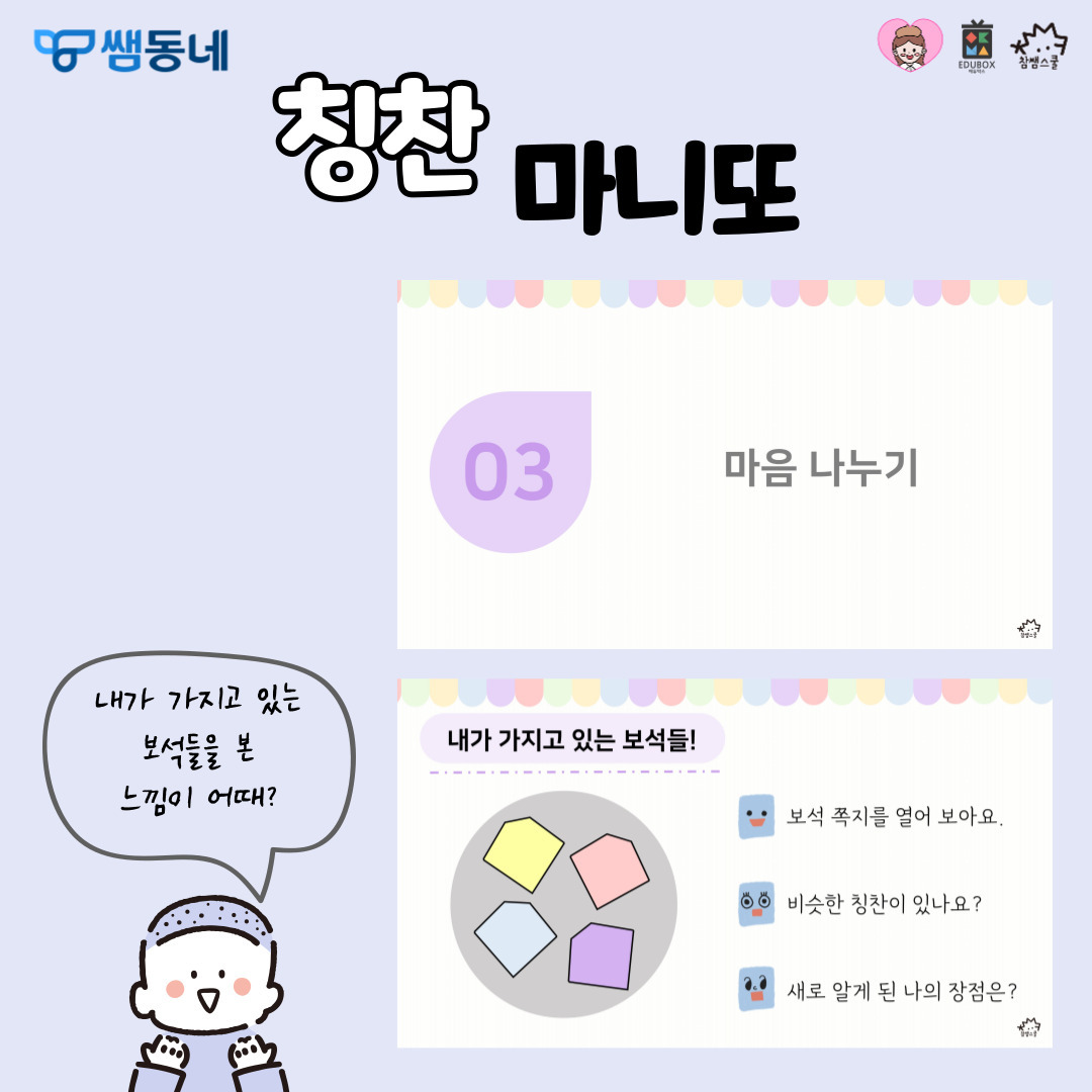 7월 9일은? 친구데이! 친구데이를 맞이하여 학급에서 함께하기 좋은 활동을 소개합니다. (꼭 친구데이가 아니더라도 하면 좋은 활동이에요.) [칭찬 마니또] 활동 방법은 PPT를 참고해주세요! 보석