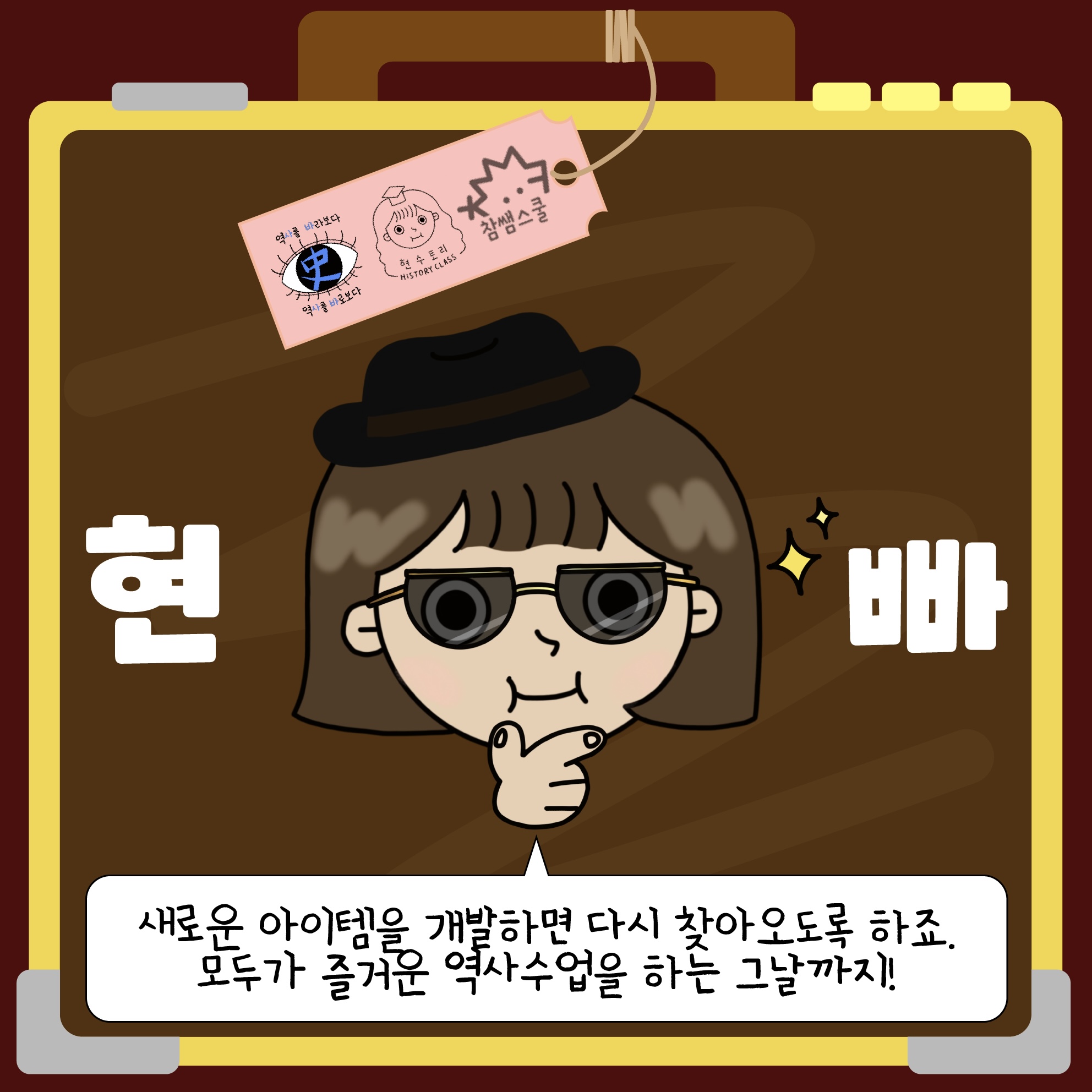현수쌤은 오늘도 역사 아이템을 개발하고 있어요. 곧 따끈따끈한 아이템을 담은 가방을 들고 다시 찾아옵니다.