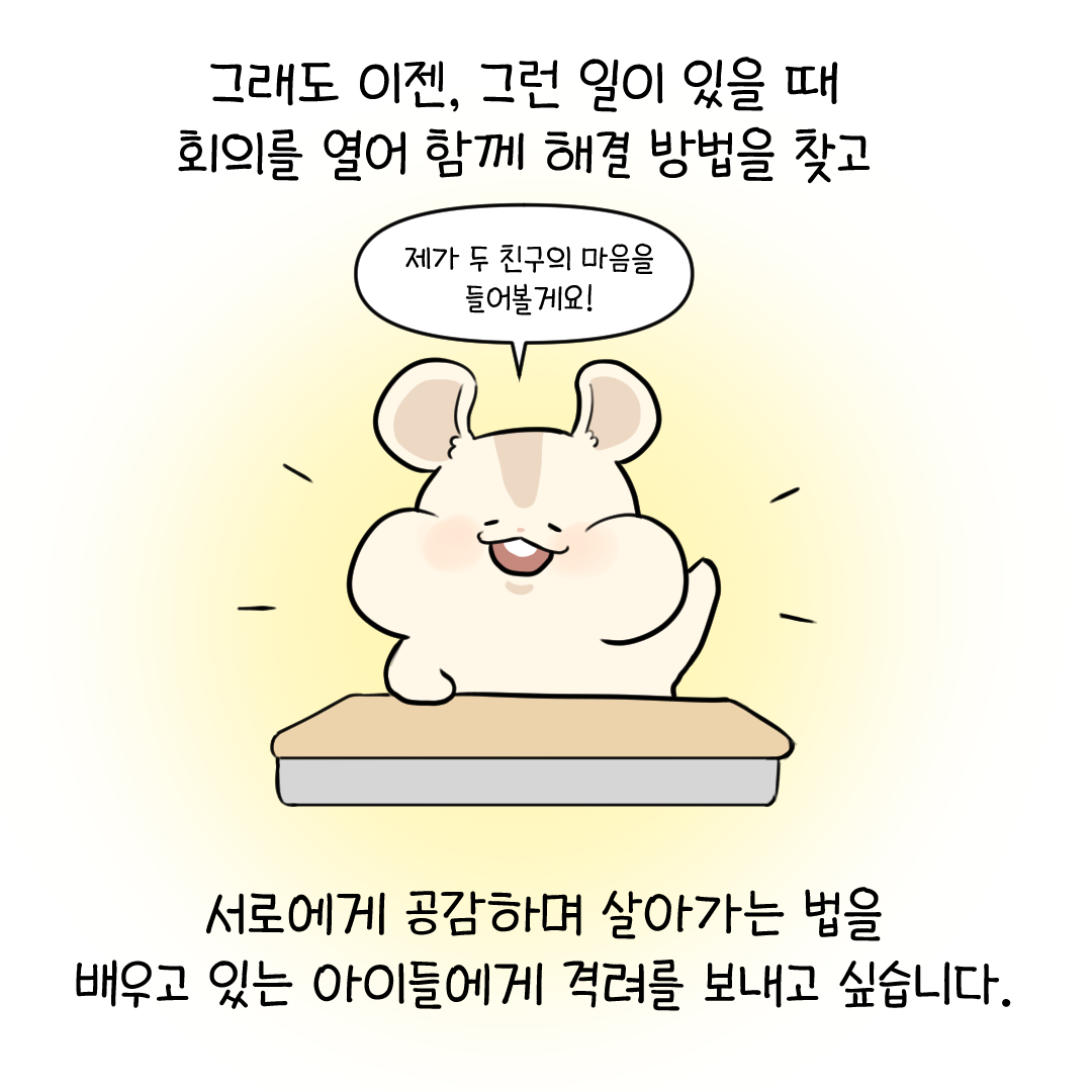 갈등이 일어났을 때 공감회의를 통해 해결해나가는 햄삐반을 칭찬하고 싶어요! :)