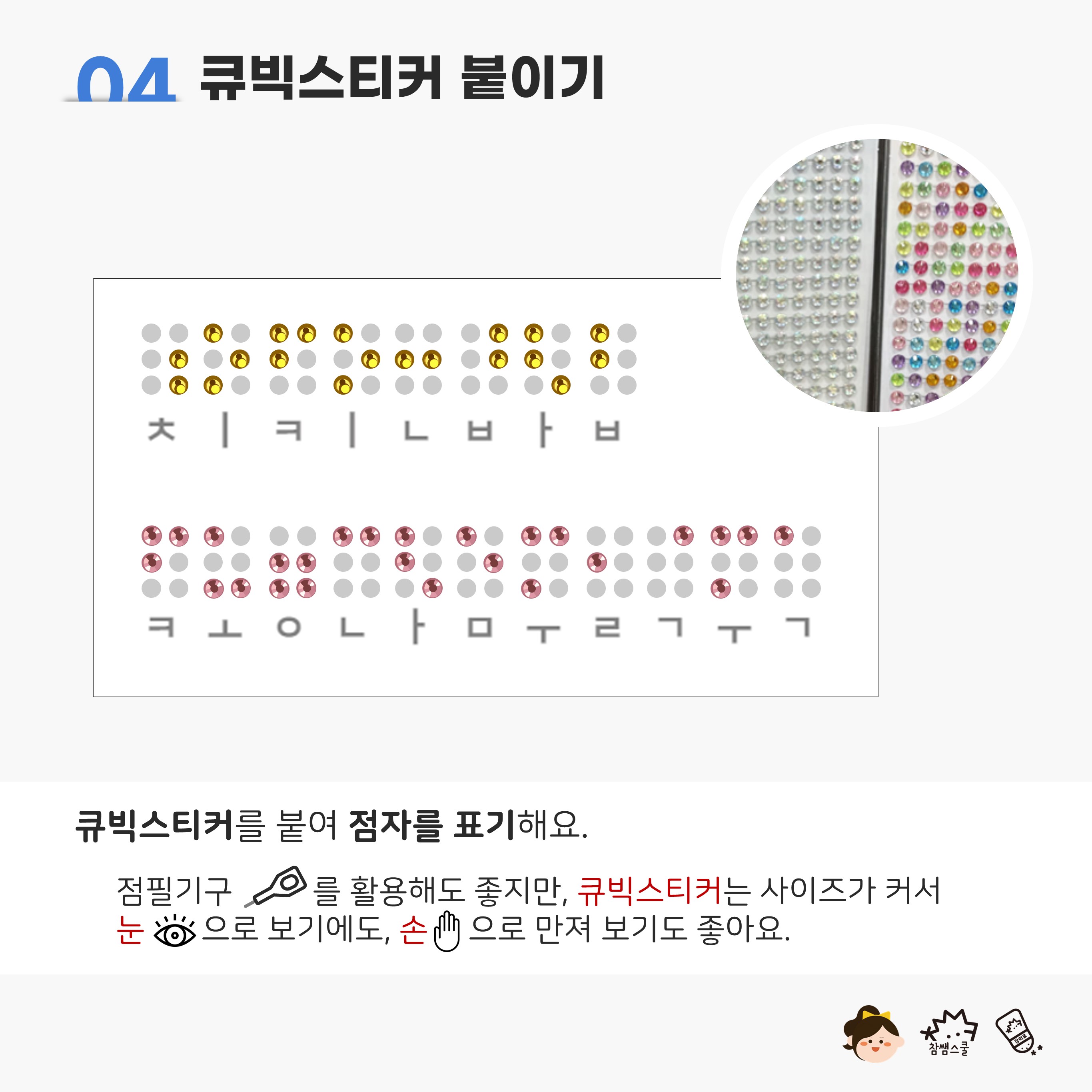 ✨큐빅스티커를 활용한 점자표기로 학생들이 눈으로 보고, 직접 만져보며 시각장애, 점자에 대한 이해를 높일 수 있어요.