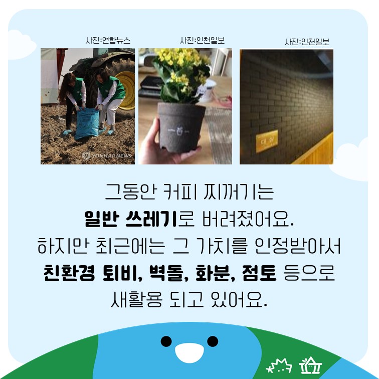 자원 순환을 통해 커피 점토, 커피 퇴비, 커피 벽돌 등으로 새활용 되고 있어요.