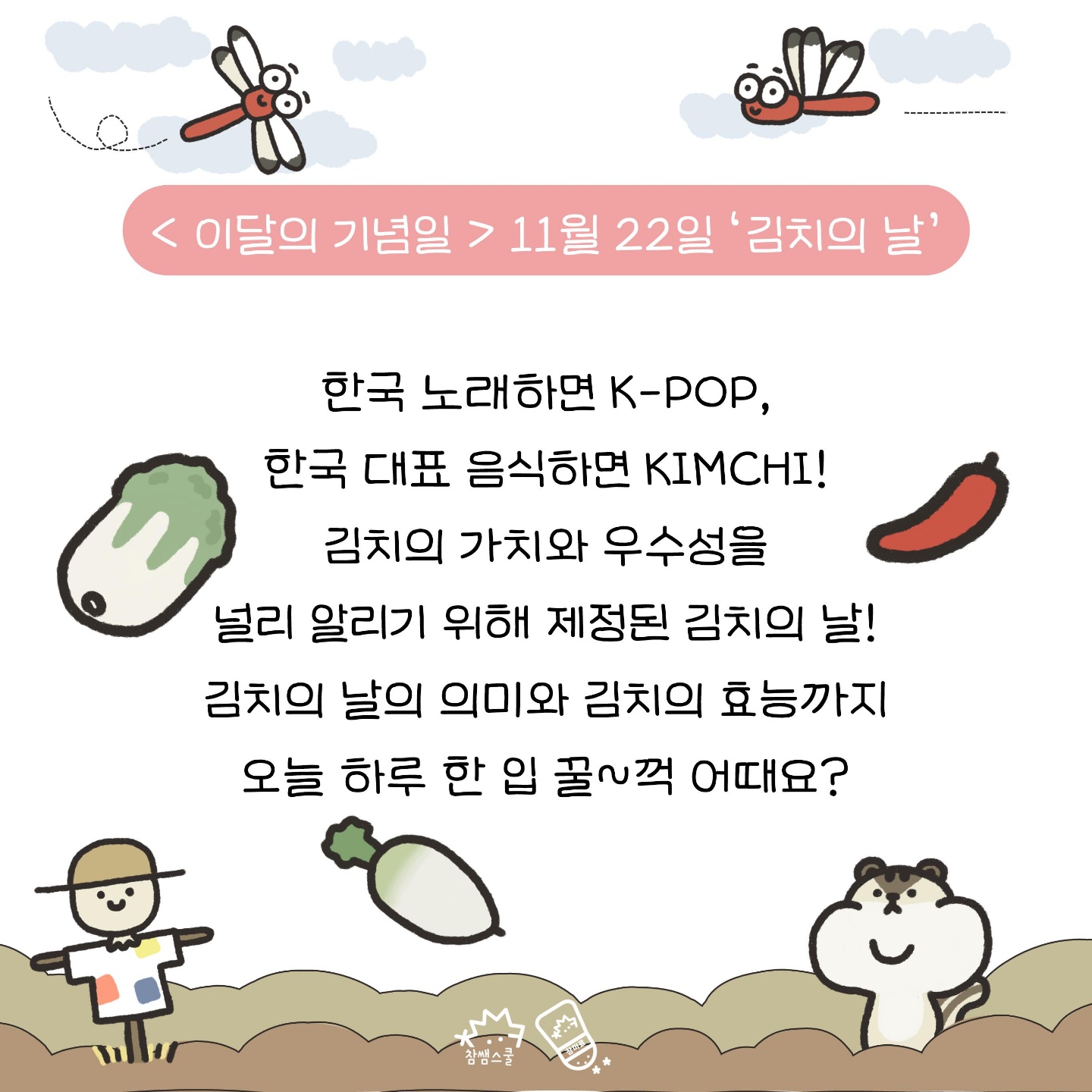 🥬이달의 기념일 : 김치의 날, 한국 노래하면 K-POP, 한국 음식하면 Kimchi! 김치의 날의 의미와 김치의 효능까지!