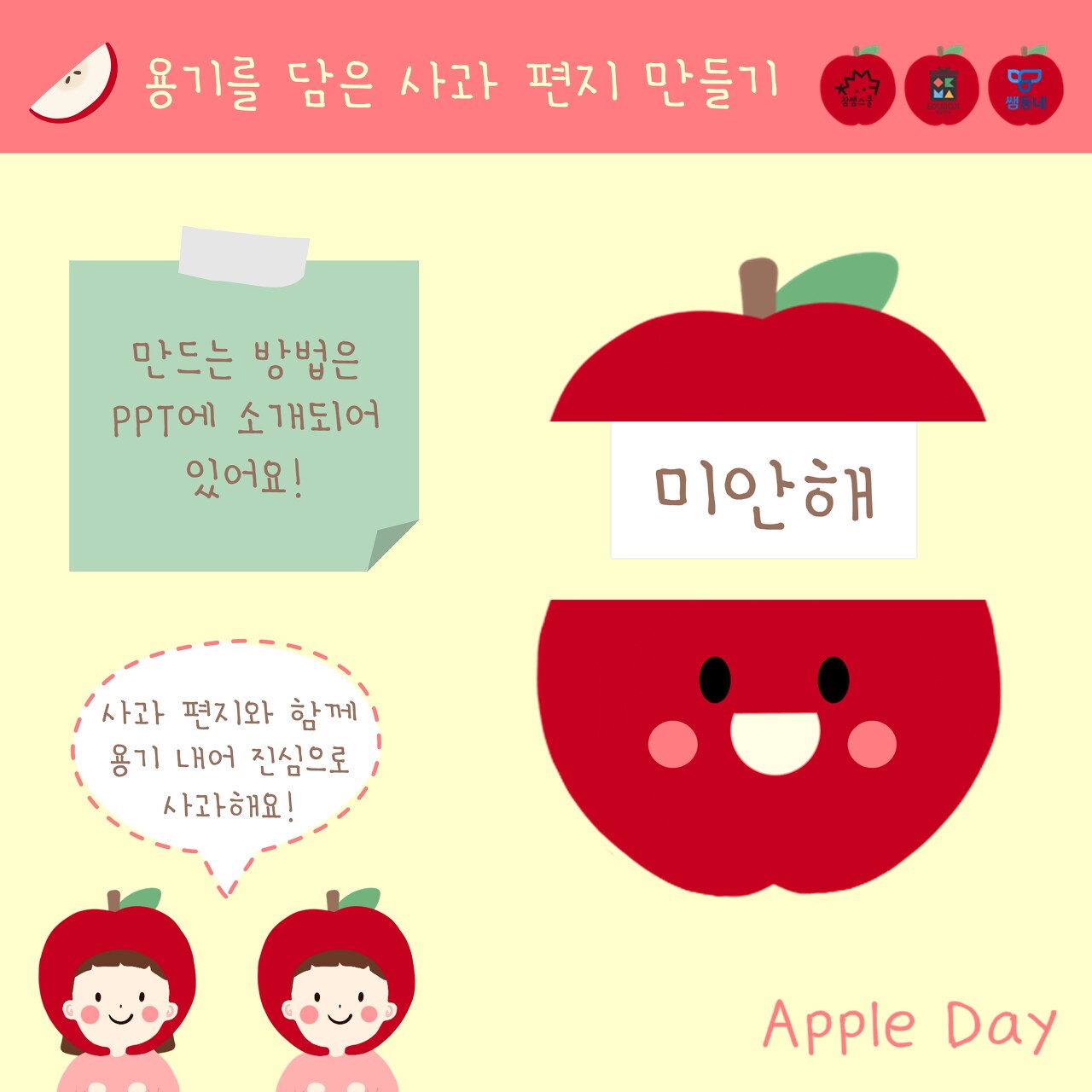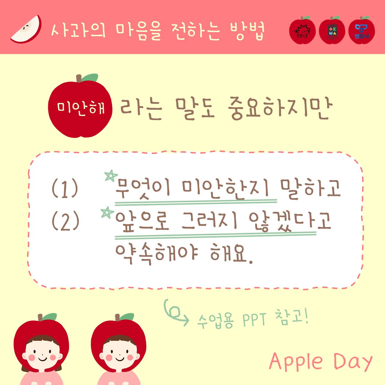 10월 24일은? 애플데이! 애플데이가 어떤 날인지 함께 살펴 볼까요? 사과의 마음을 전하는 방법을 함께 공부해요! (수업용 PPT 참고) 사과 편지와 함께 용기 내어 친구에게 사과해 보아요! 만드는