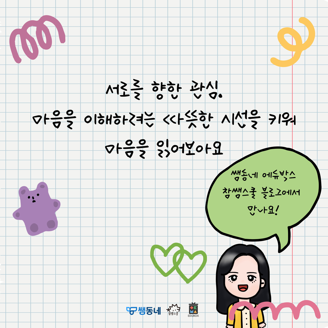 9월 시시콜콜 🎵말하지 않아도~ 알아요~🎶 서로에 대한 관심과 마음을 이해하려는 따뜻한 시선을 키워 서로의 마음을 이해해요 1. 마음이 안보인다고? 시를 읽고 이야기 나누어요. 2. 마음 읽기