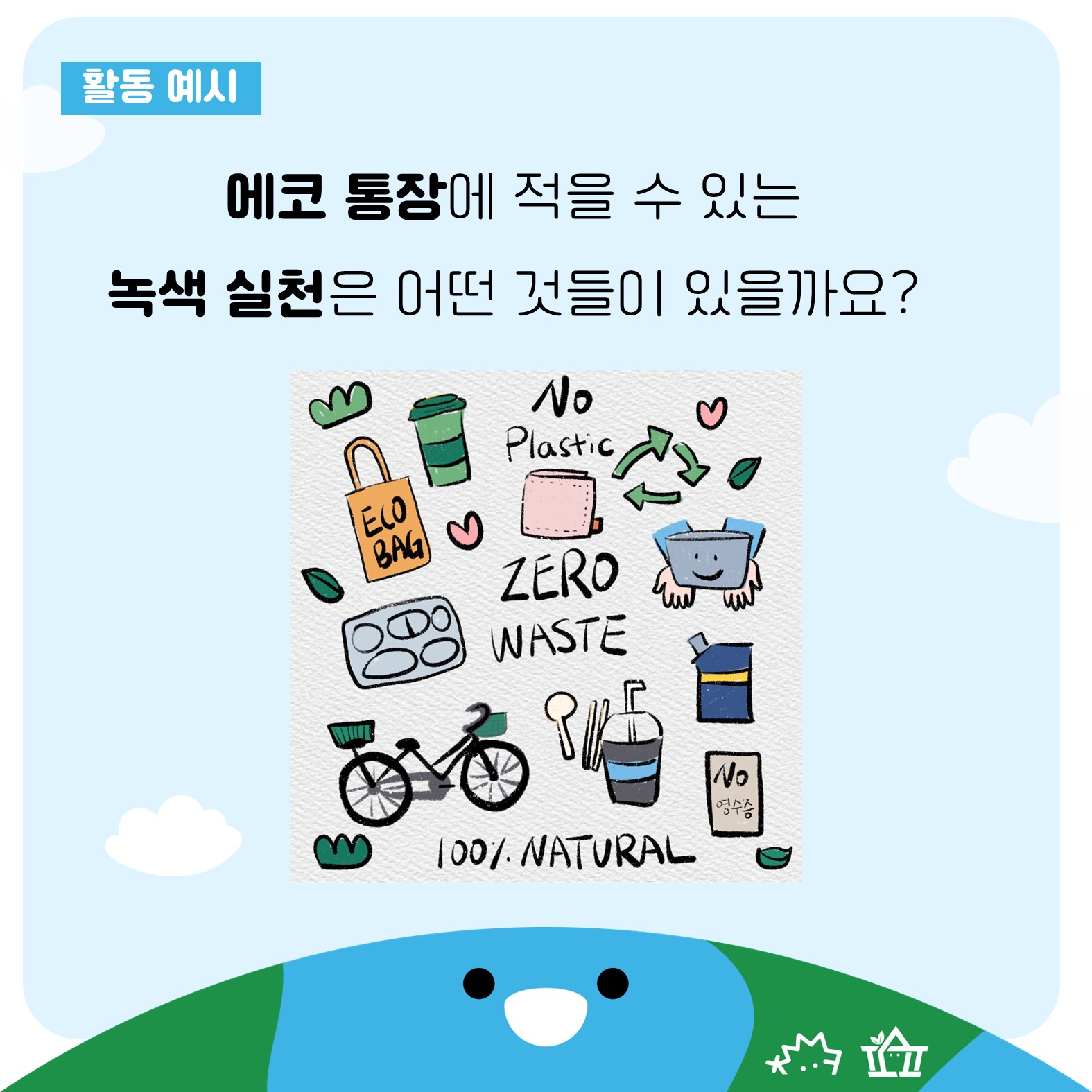 에코 통장에 적을 수 있는 녹색 실천은 어떤 것들이 있을까요?