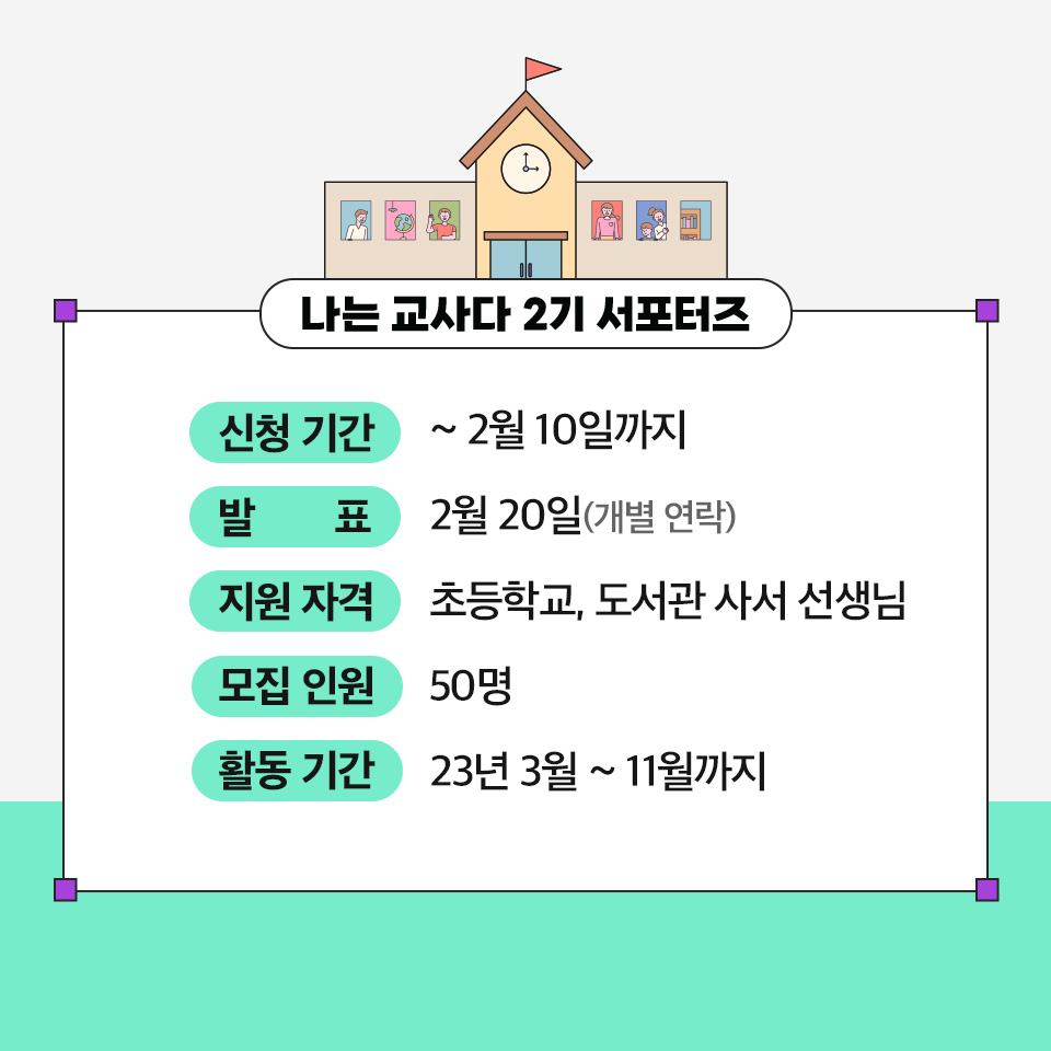 카테고리 없음 나는 교사다 2기 👩🏫👨🏫서포터즈 모집(feat. 위즈덤하우스) by 참쌤스쿨 2023. 1. 11. 2기 서포터즈 선생님들에게는 3월부터 11월까지 매월 1권씩 책을 선정😊하여 보내드려요! <한 학기 한 권 읽기> 수업지도안도 보내드립니다. 신청하기 : http://bit.ly/3X0k6LI 공유하기 게시글 관리 참쌤스쿨 저작자표시 (새창열림) 댓글