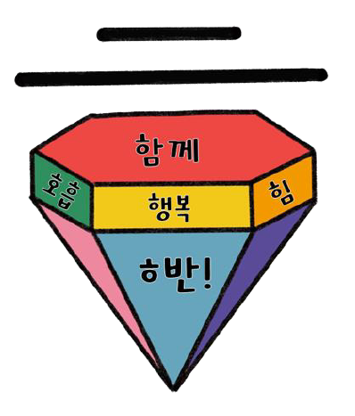 아이들이 함께 만든 로고에요. 네 가지 가치가 담겨있고 두 개의 줄과 보석이 'ㅎ' 모양을 하고 있죠.