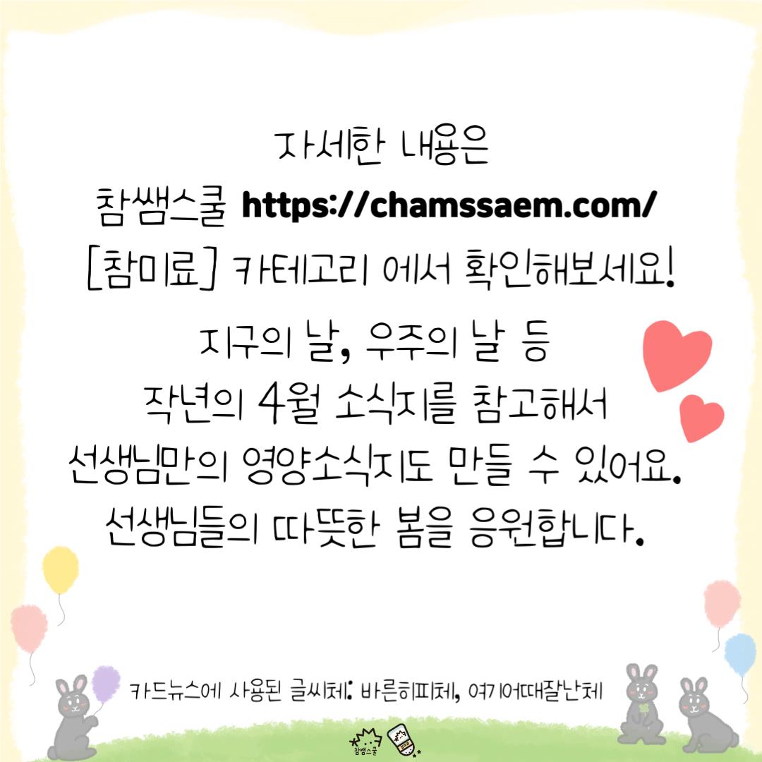🌷똑똑(톡톡)~ 꽃이 피는 푸르른 계절인 4월에 참미료가 영양소식지로 인사드립니다.
