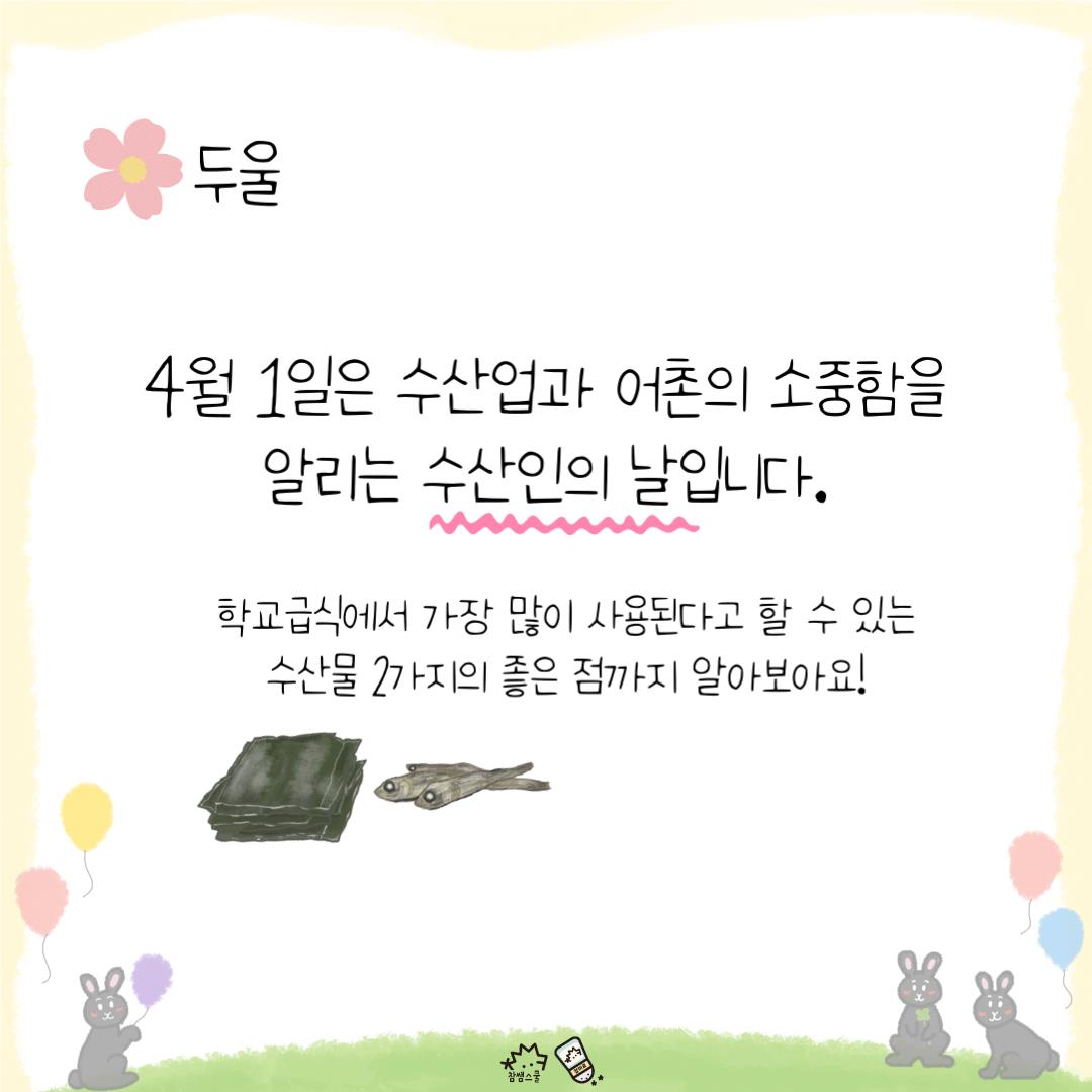 4월 1일은 수산업과 수산인들의 중요성이 알리는 ‘수산인의 날’이에요!