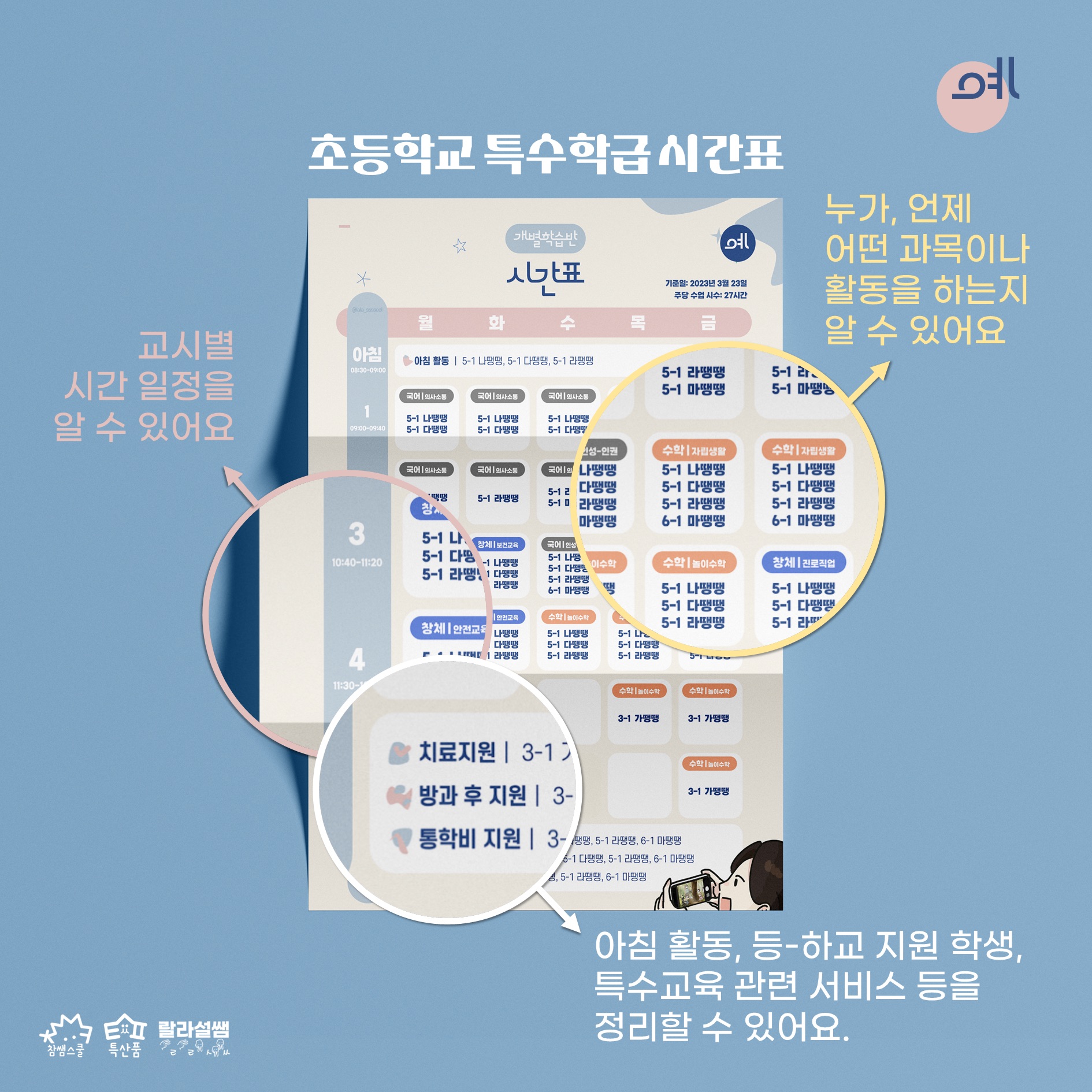 - 우리 반 모든 학생의 통합학급 시간표를 한 번에 살필 수 있어요.