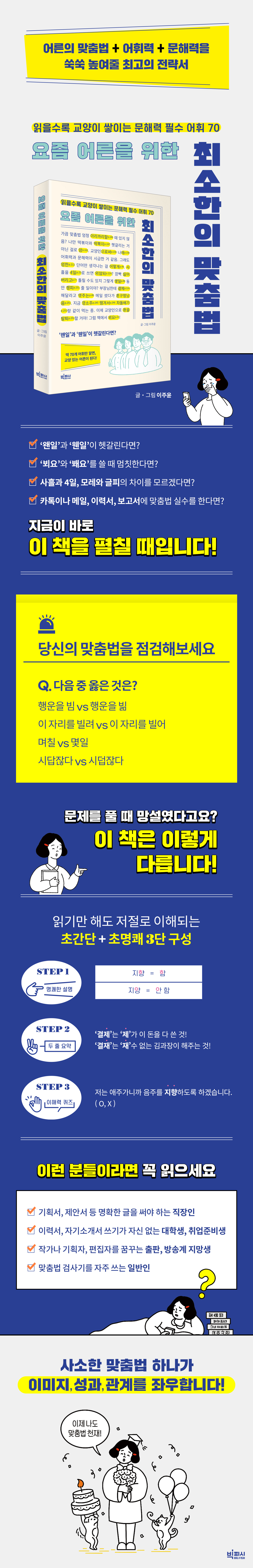문자, 카카오톡, 가정통신문, 알림장, 각종 공문 등 짧든 길든 제대로 문장을 써내야 하는 시대. 이때 사소한 맞춤법이라도 틀리면 신뢰는 와장창 무너지게 됩니다. “맞춤법을 이토록 유쾌하게 설명한 작가는 없다”라는 찬사를 받았던 이주윤 작가가 이번에는 대한민국 성인이 가장 헷갈리는 어휘 70개를 엄선해 꼭 알아야 할 필수 맞춤법을 소개합니다.