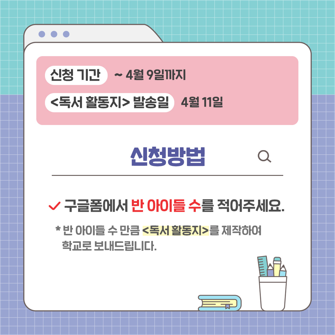 구글폼에서 반 아이들 수를 적어주세요. 반 아이들 수만큼 '독서 활동지'를 제작하여 학교로 보내드립니다.