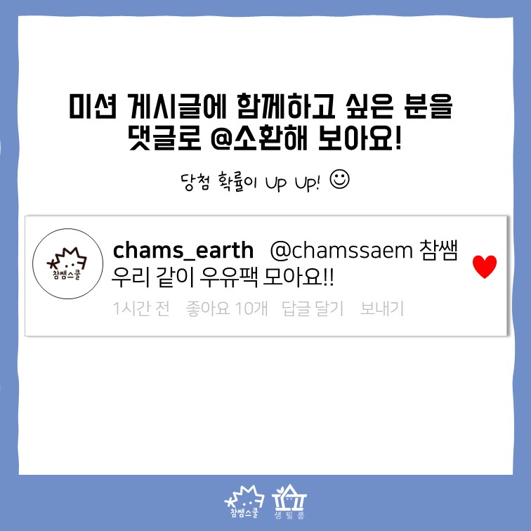 실천 결과를 SNS에 태그와 함께 공유해 주시면 추첨을 통해 선물도 드려요! 함께 참여하고 싶은 분을 이 게시글에 댓글로 태그해 주시면 당첨 확률이 UP!