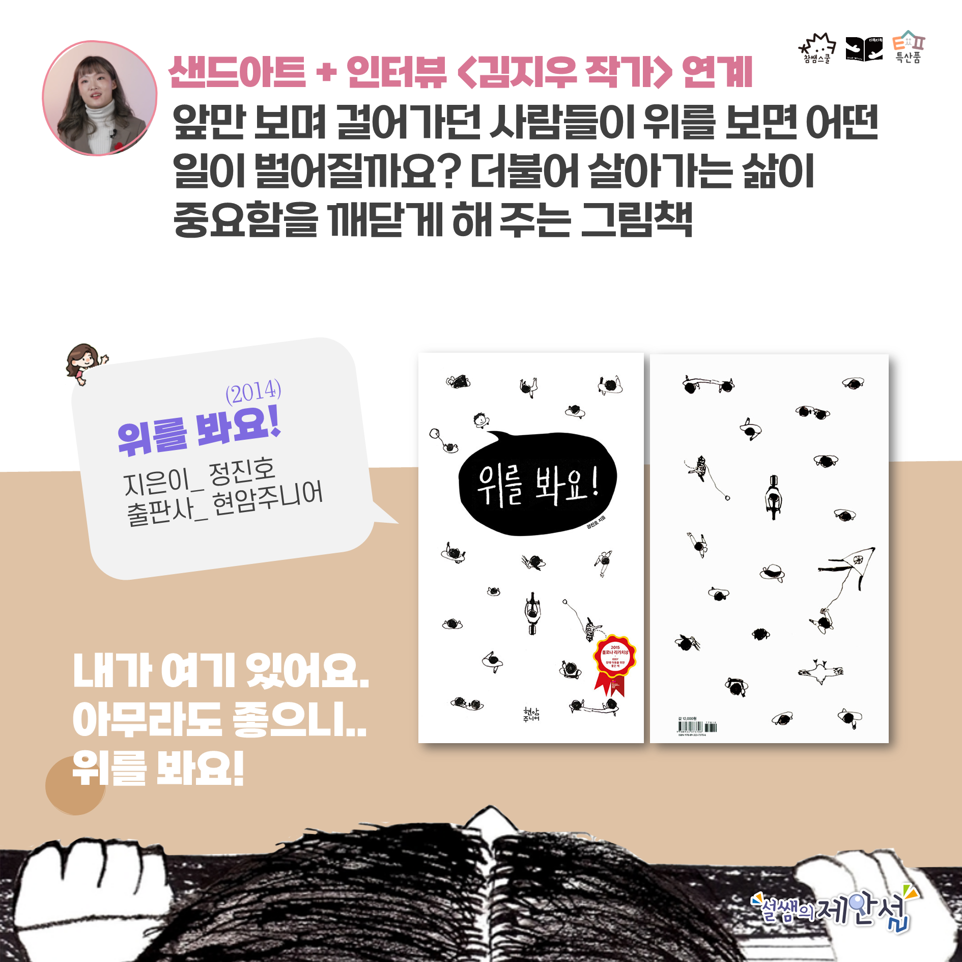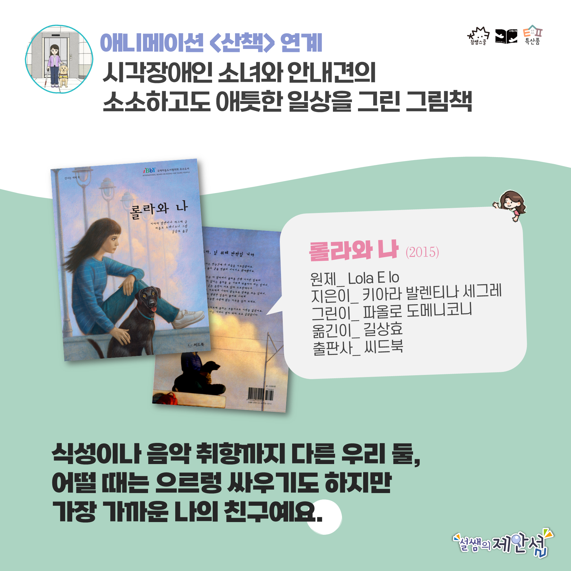 ‘단짝 친구들’은 옴니버스 형식으로 총 섹션 ①~④로, 총 영상은 38분 32초입니다. 오늘은 섹션③ 산책(애니메이션)과 섹션④ 김지우 작가 인터뷰와 샌드아트와 연계 활동 추천 책을 소개합니다.