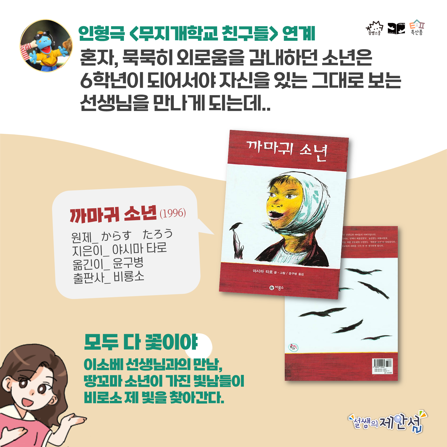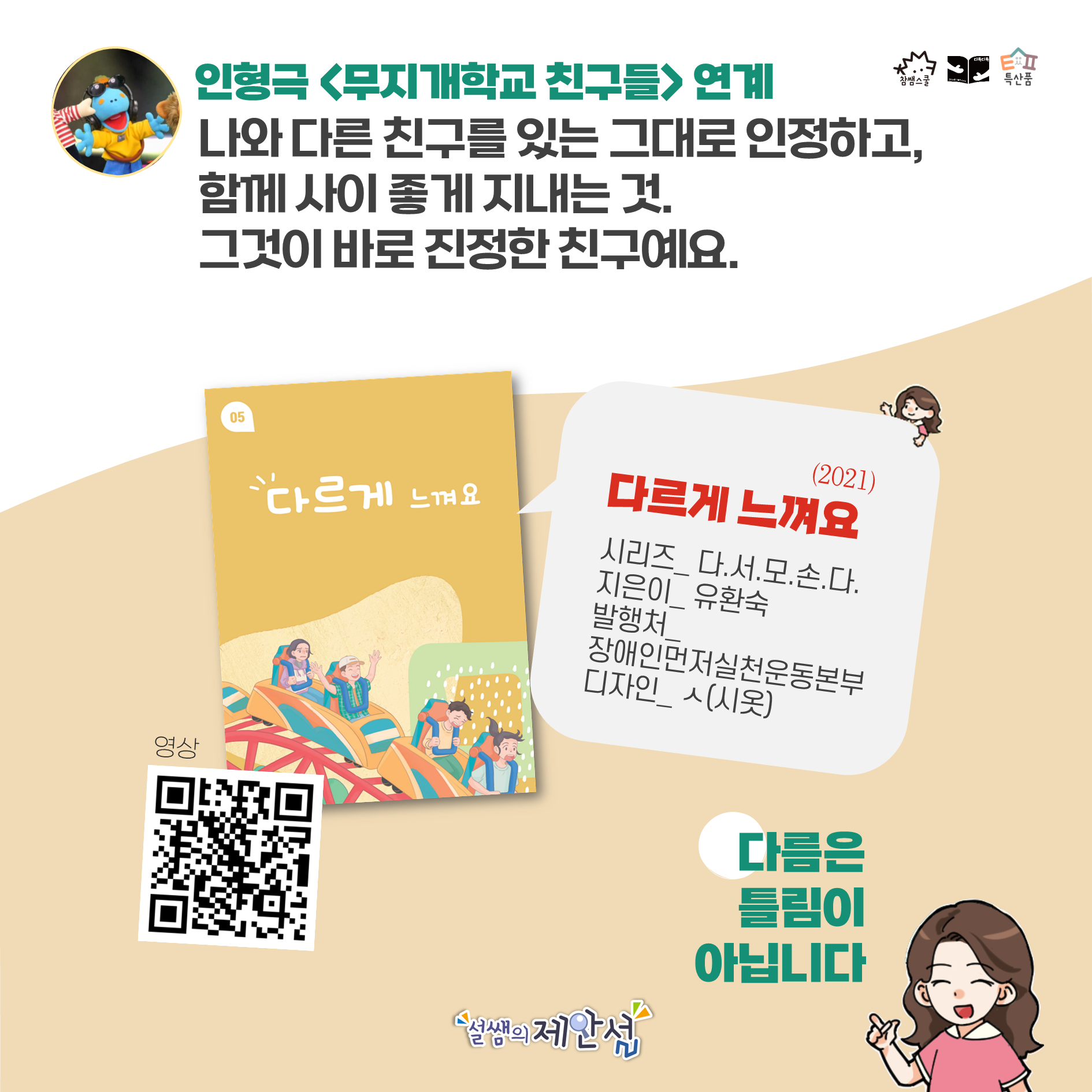 ‘단짝 친구들’은 옴니버스 형식으로 총 섹션 ①~④로, 총 영상은 38분 32초입니다. 오늘은 섹션① 무지개 학교 친구들(인형극)과 섹션② 정은혜 캐리커처 작가 인터뷰와 연계 활동 추천 책을 소개합니다.