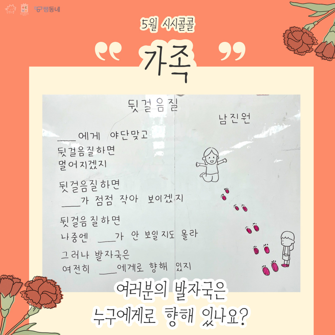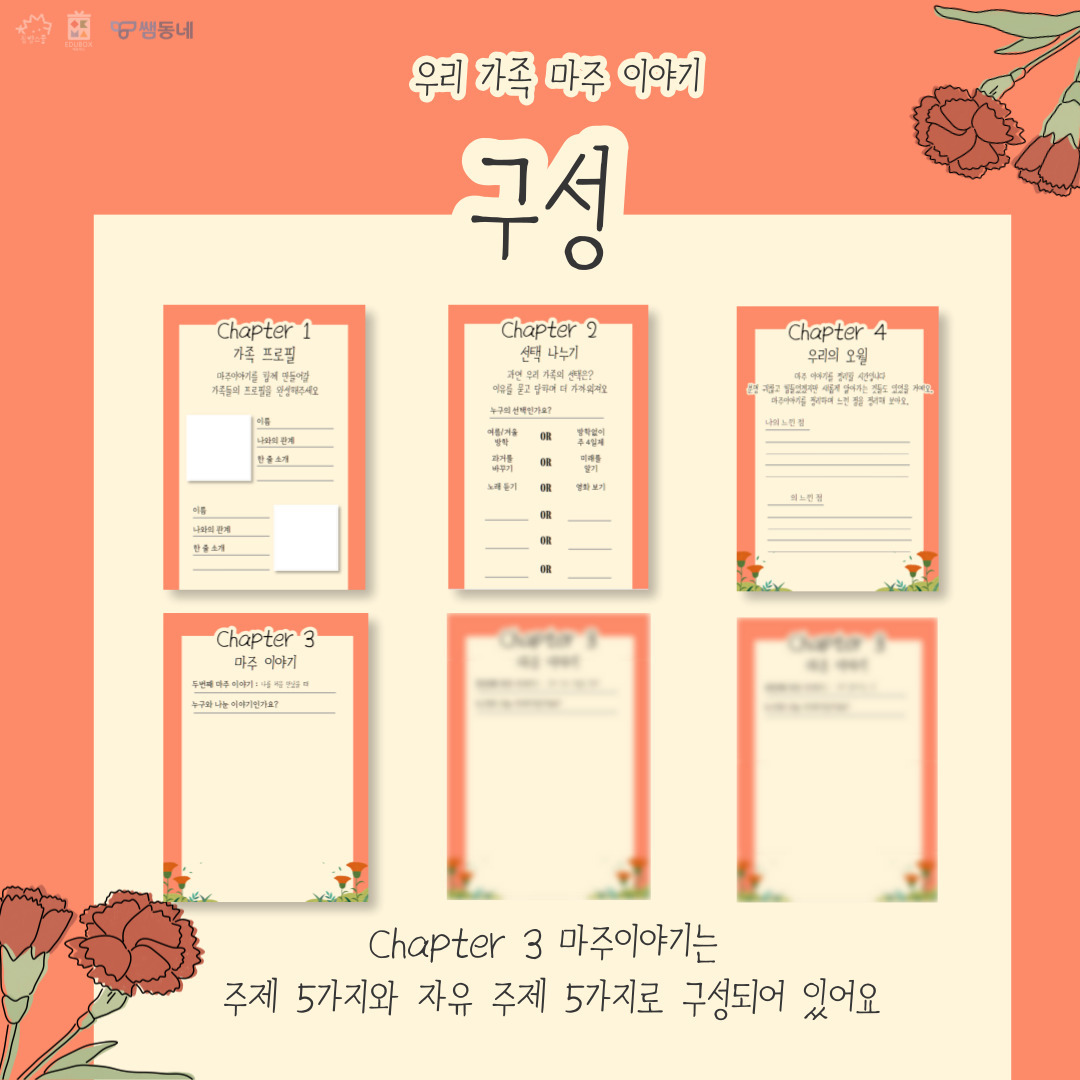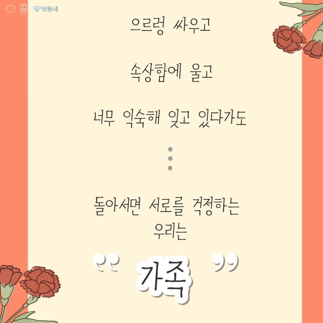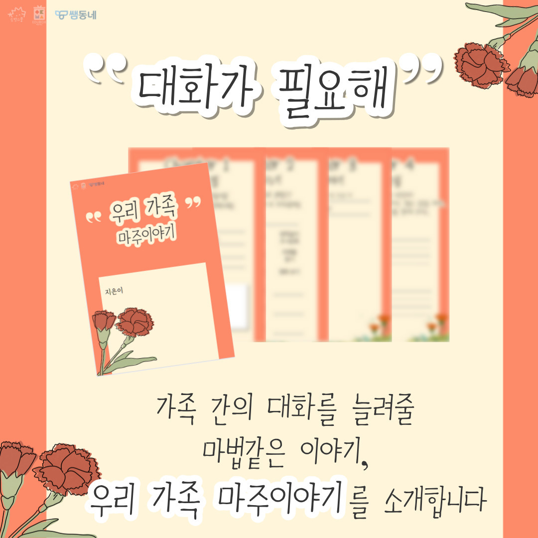 5월은 가정의 달! 여러분은 가족과 많은 대화를 나누고 계신가요? 다투고 가끔은 짜증부려도 사랑스러운 나의 가족. 나의 가족과 더 가까워질 수 있는 마주 이야기를 5월 한 달동안 실천해보세요