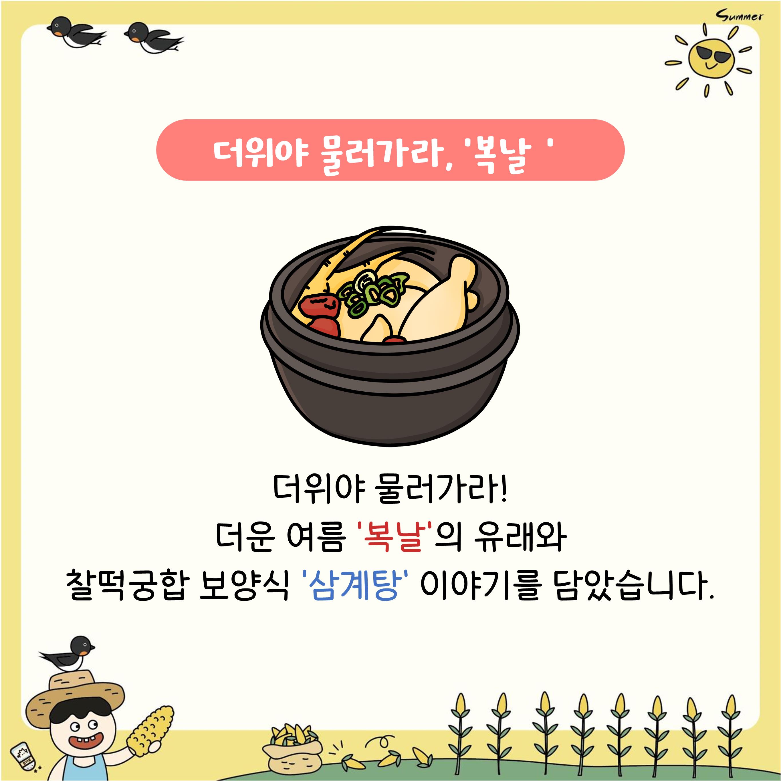 🐓초복, 중복, 말복 삼복! 왜 복날엔 뜨거운 삼계탕을 보양식으로 먹을까요? 소식지에서 확인할 수 있어요.