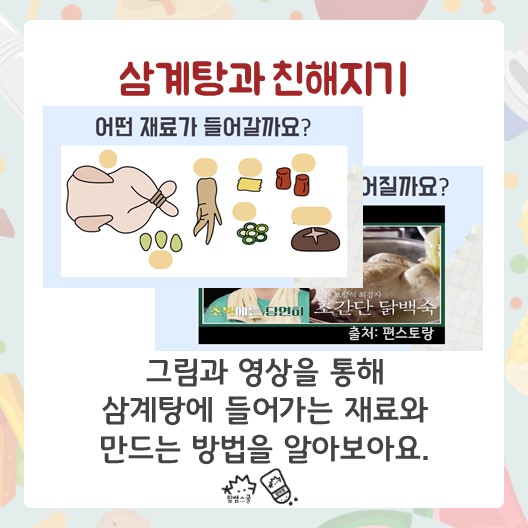 ☀더운 여름날에 세번 맞이하게 되는 복날, 삼복에 대해서 알아보고 건강을 위한 삼계탕을 만들어보는 수업이에요.
