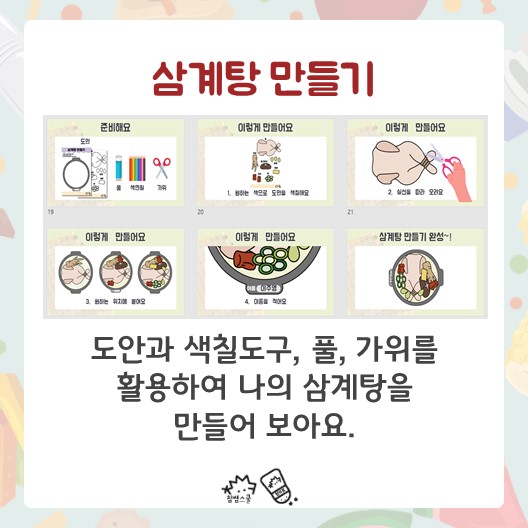 ✂마지막으로 삼계탕 만들기 자료를 색칠하고, 오리고 붙이며 나만의 삼계탕을 만들어보면 끝!