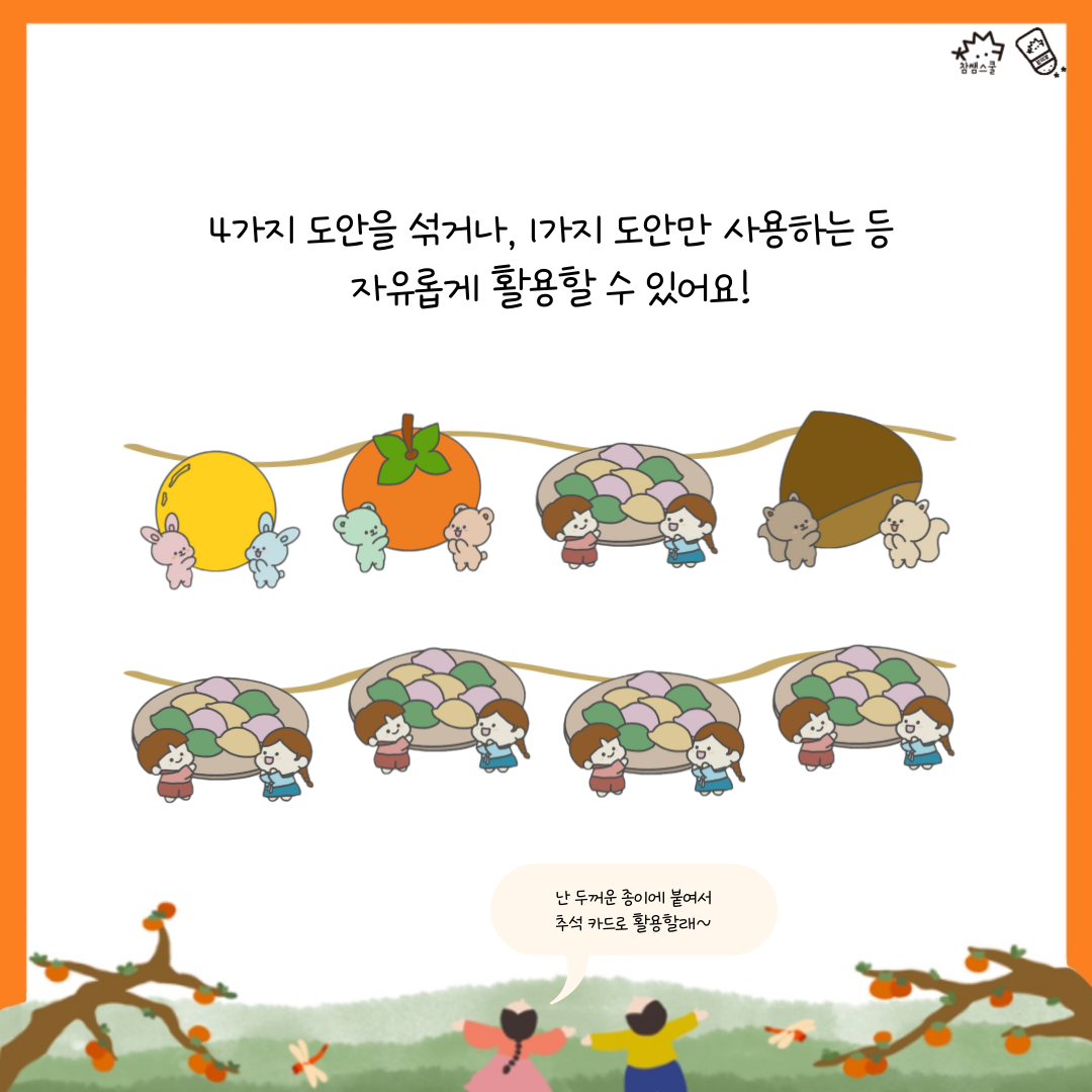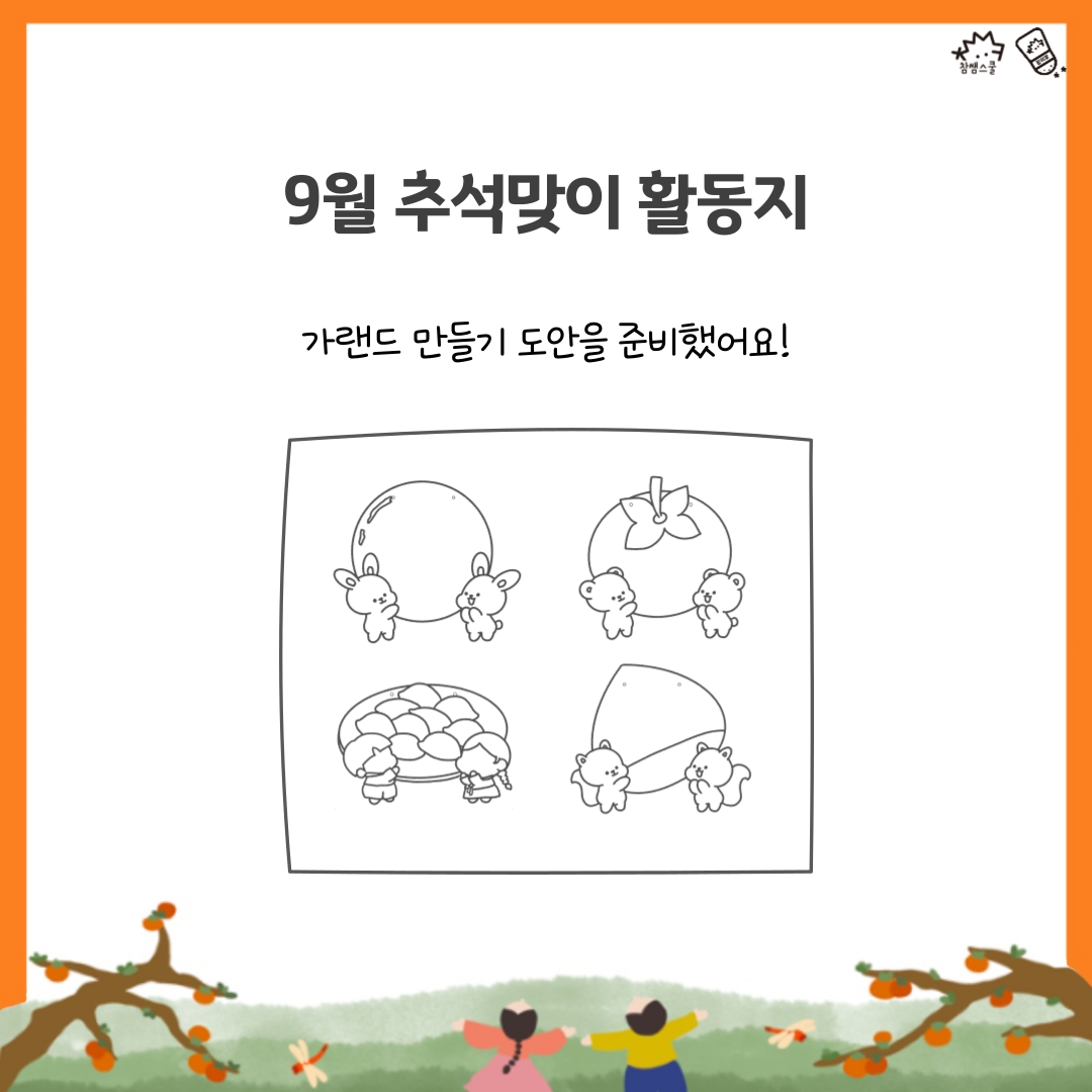 ✂ 이번 소식지에 포함된 활동지는 추석 테마의 가랜드에요,  달, 송편, 밤, 감 4가지 모양을 자유롭게 사용할 수 있어요 ☺