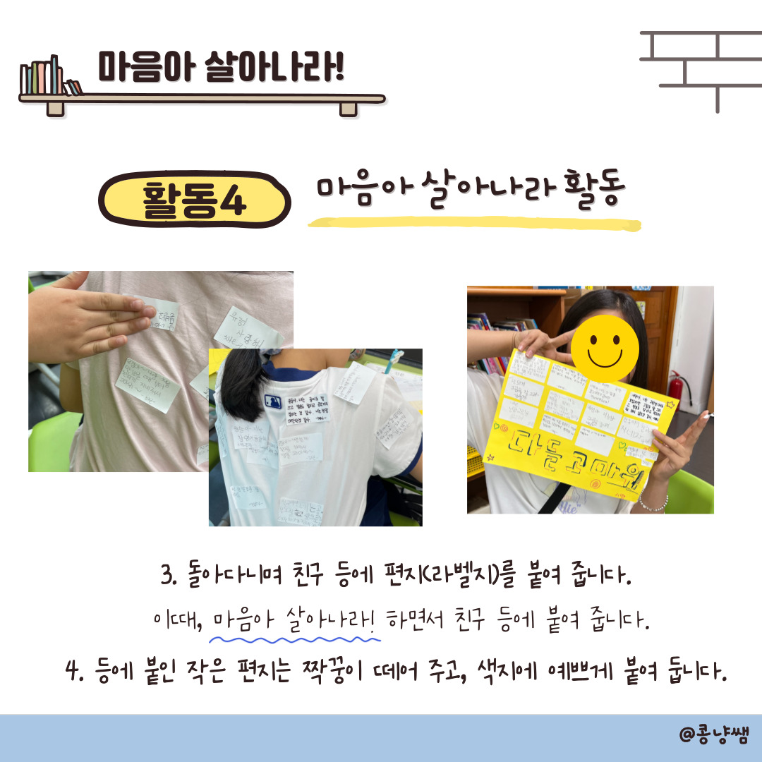 2. 돌아다니며 친구의 등에 편지를 붙입니다! “마음아 살아나라!” 격려하며 편지를 붙여 줍니다.