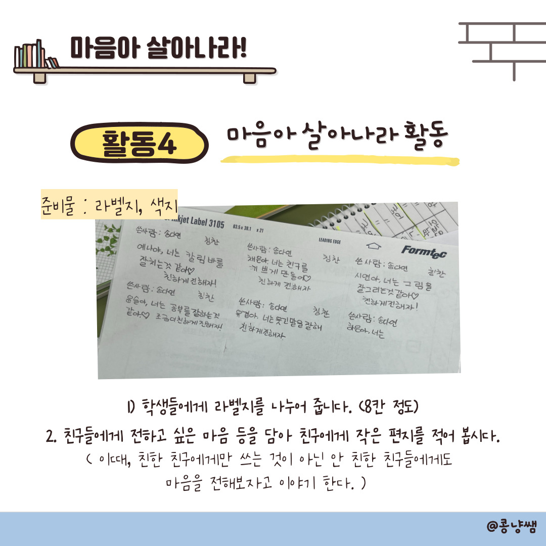1. 라벨지에 친구의 마음을 살릴 수 있는 편지( 칭찬, 고마움, 미안함 )를 씁니다.