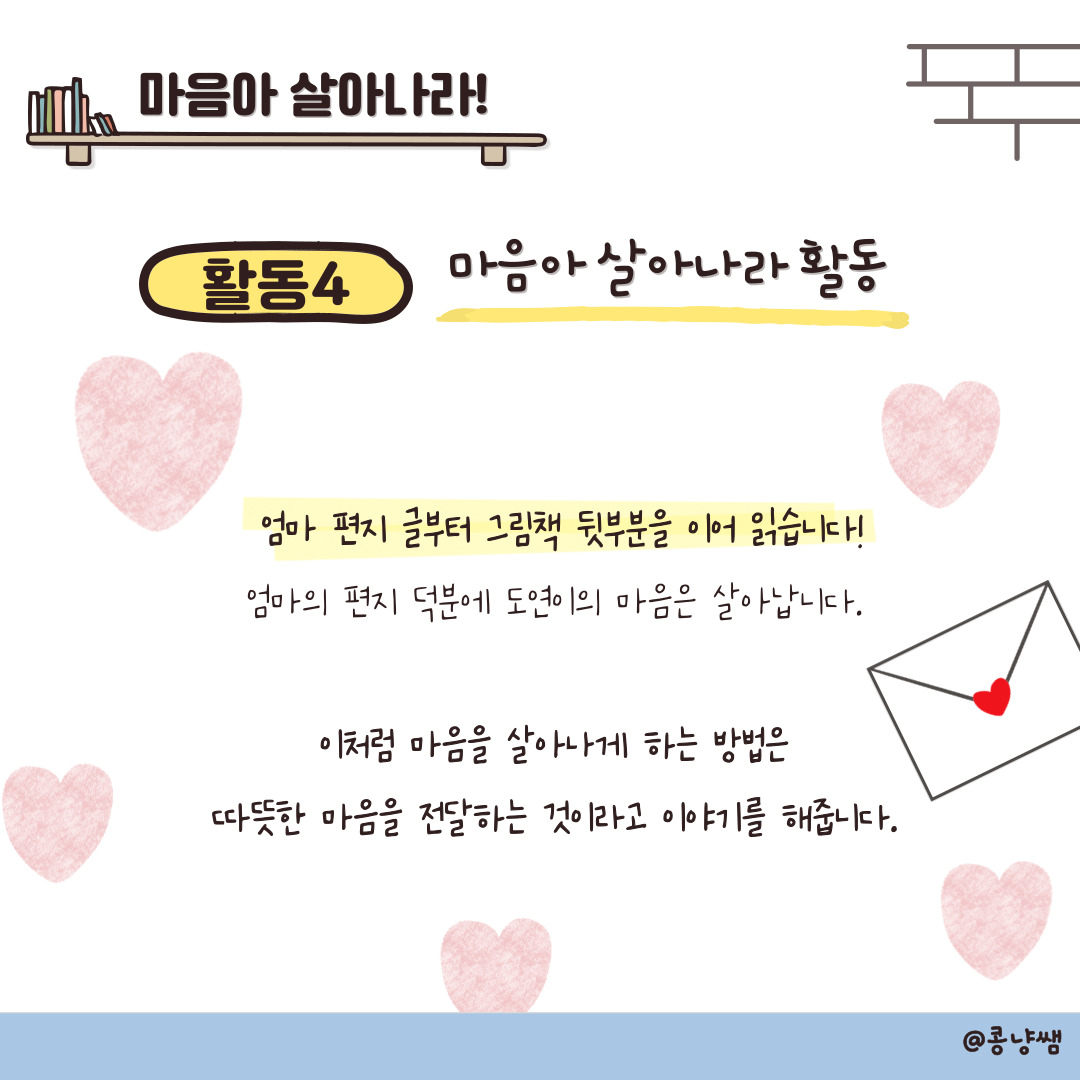 도연이의 마음을 살아나게 도와준 엄마의 편지를 이야기 하며, 마음아 살아나라 활동을 해봅니다!