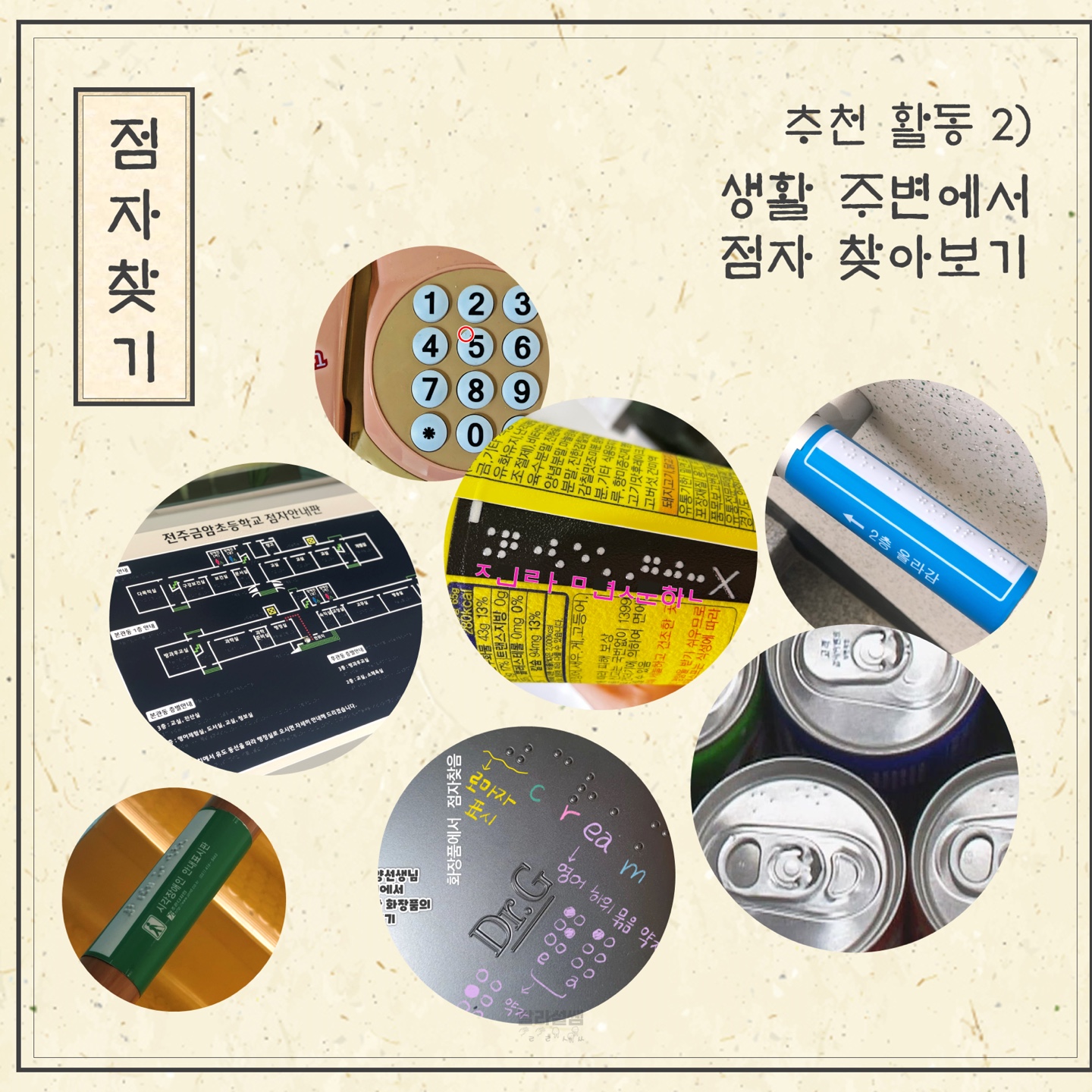 [2️⃣두 번째 활동] 우리 생활 주변에서 점자를 찾아보고 이야기 나눠봐요.