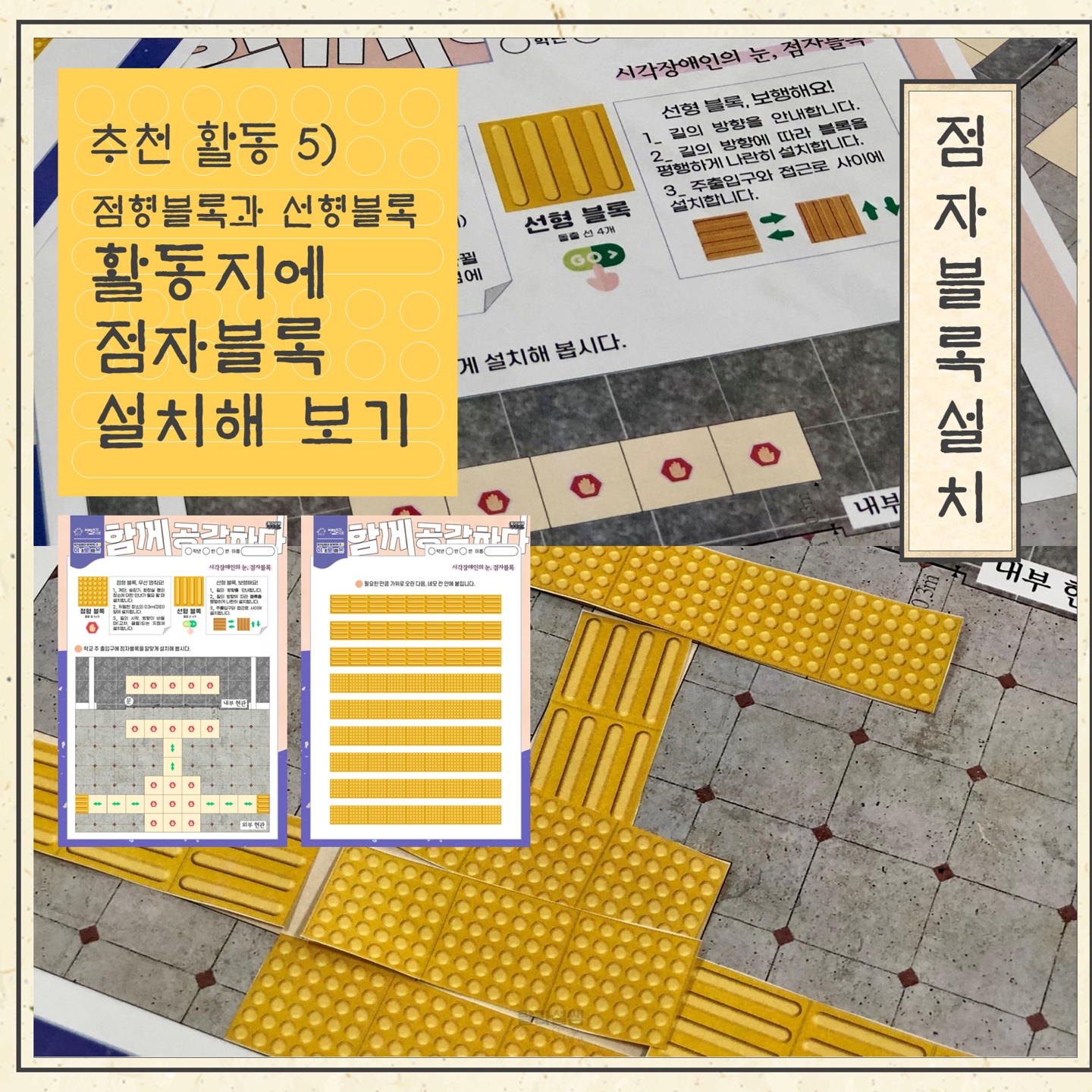 점형블록과 선형블록의 차이를 알아보고, 활동지에 점자블록을 설치해 봐요.